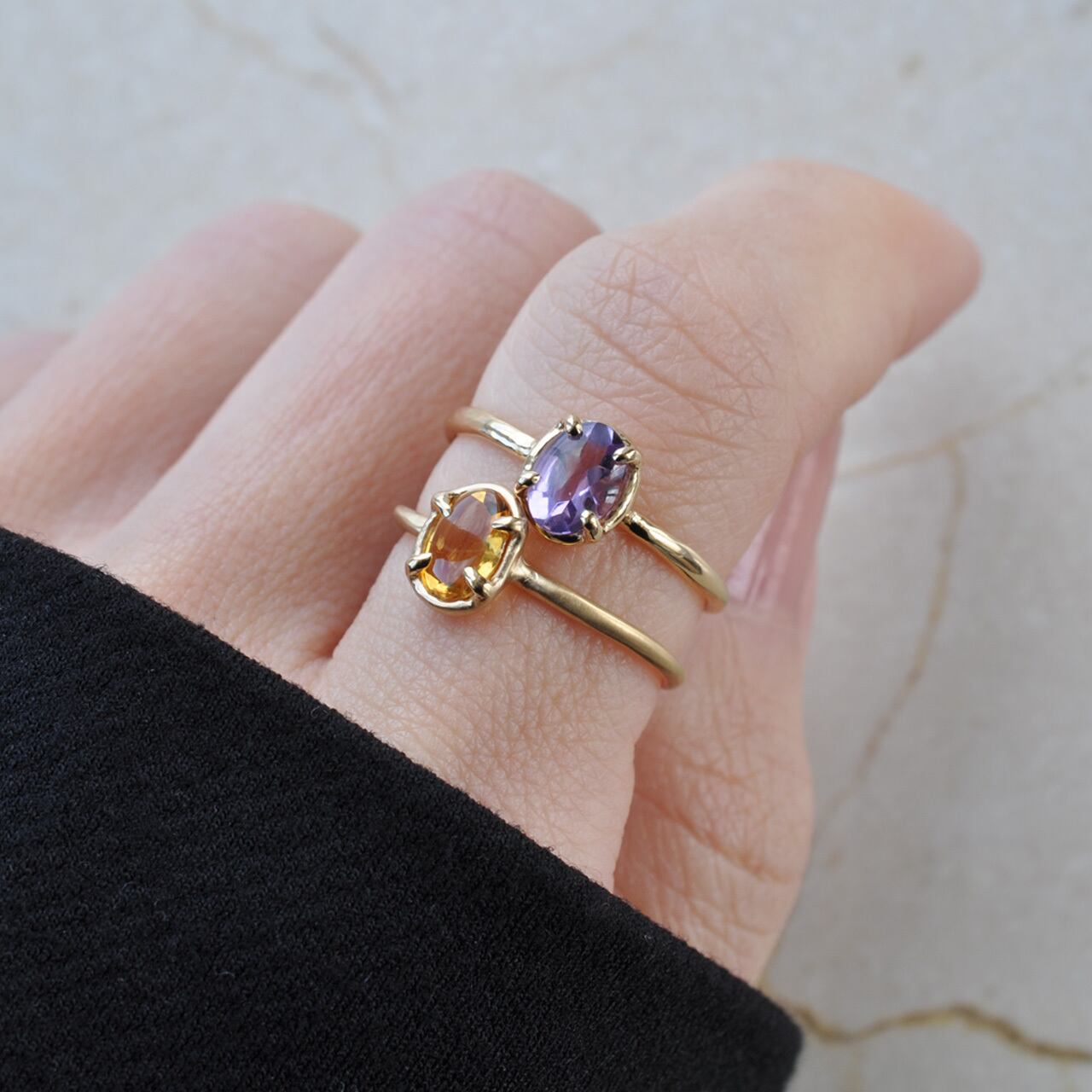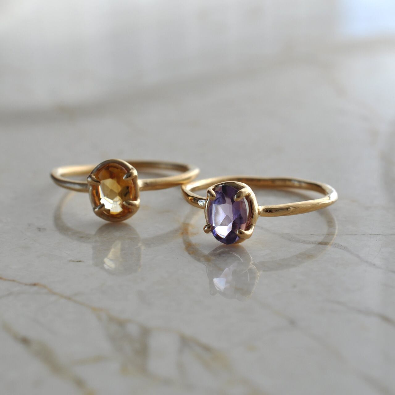 こちらは、石の上面が丸みを帯びたカボションカット、下側がキラキラ輝くファセットカットになったバフトップカットが施されたアメジスト。