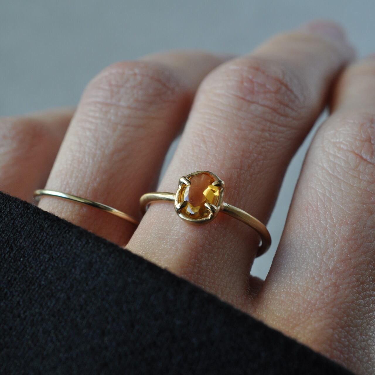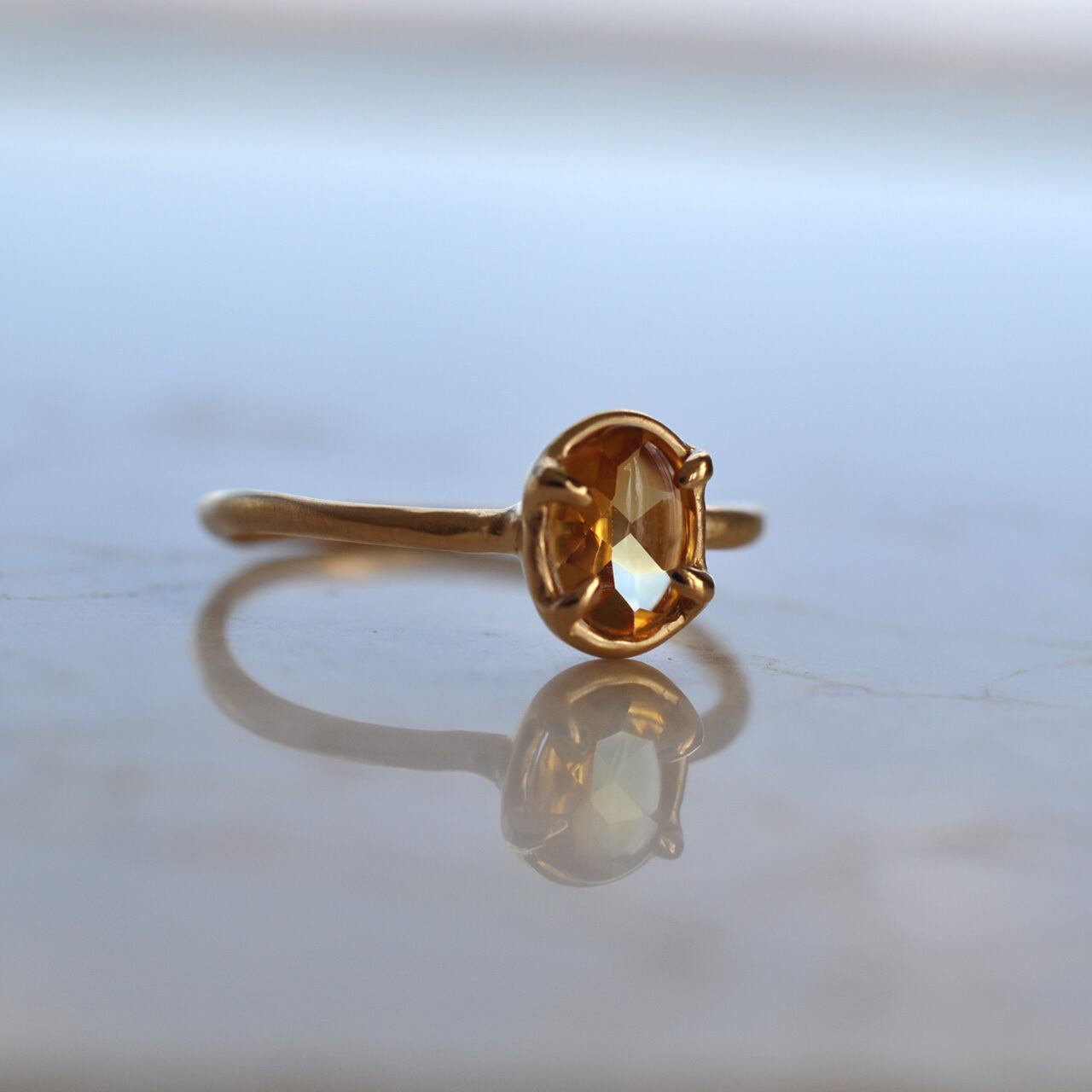 こちらは、石の上面が丸みを帯びたカボションカット、下側がキラキラ輝くファセットカットになったバフトップカットが施されたシトリン。