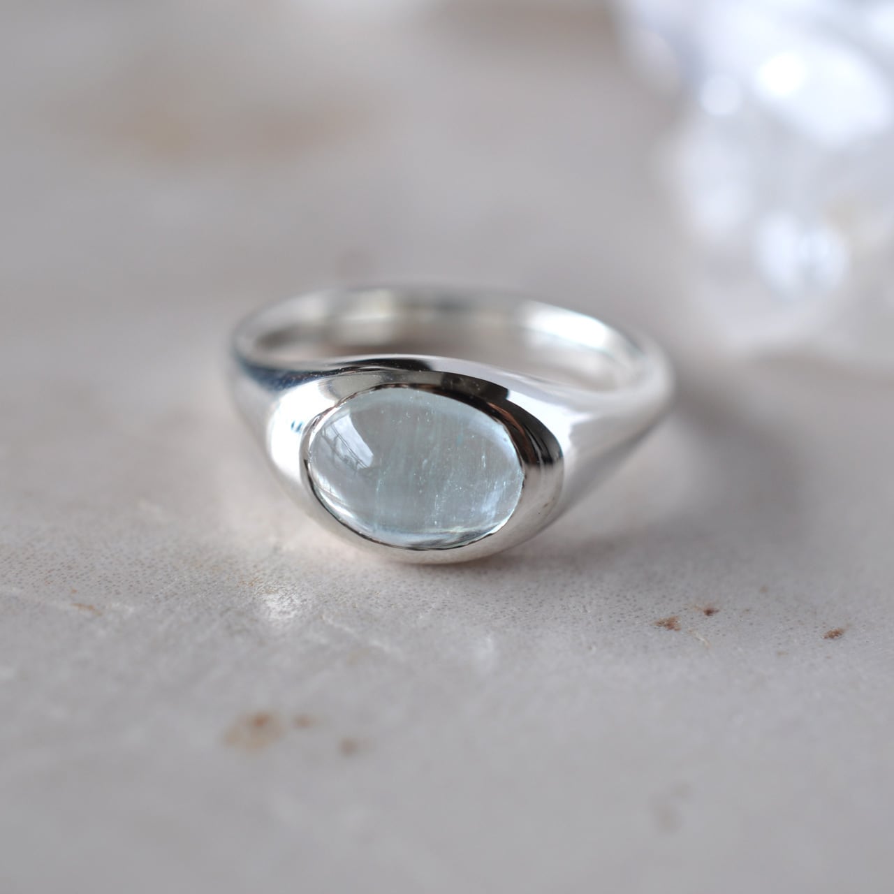 澄み渡る空や海を思わせる、透明感あふれるアクアマリンをセットした1点物のシルバーリング。