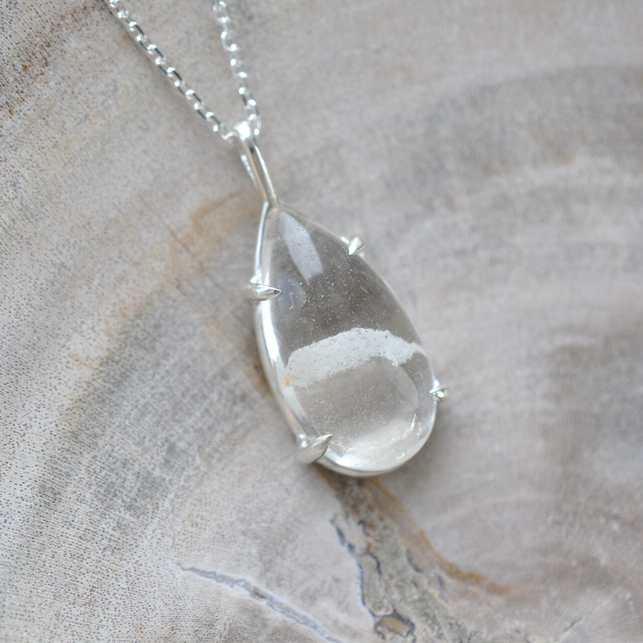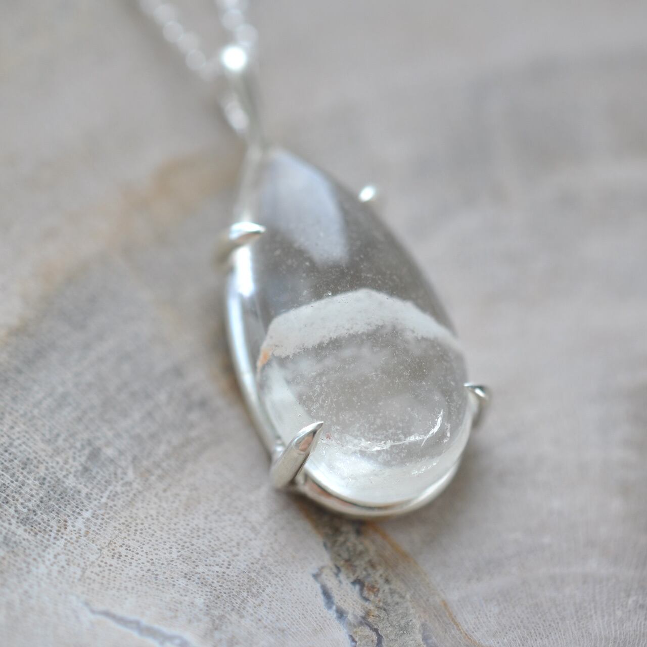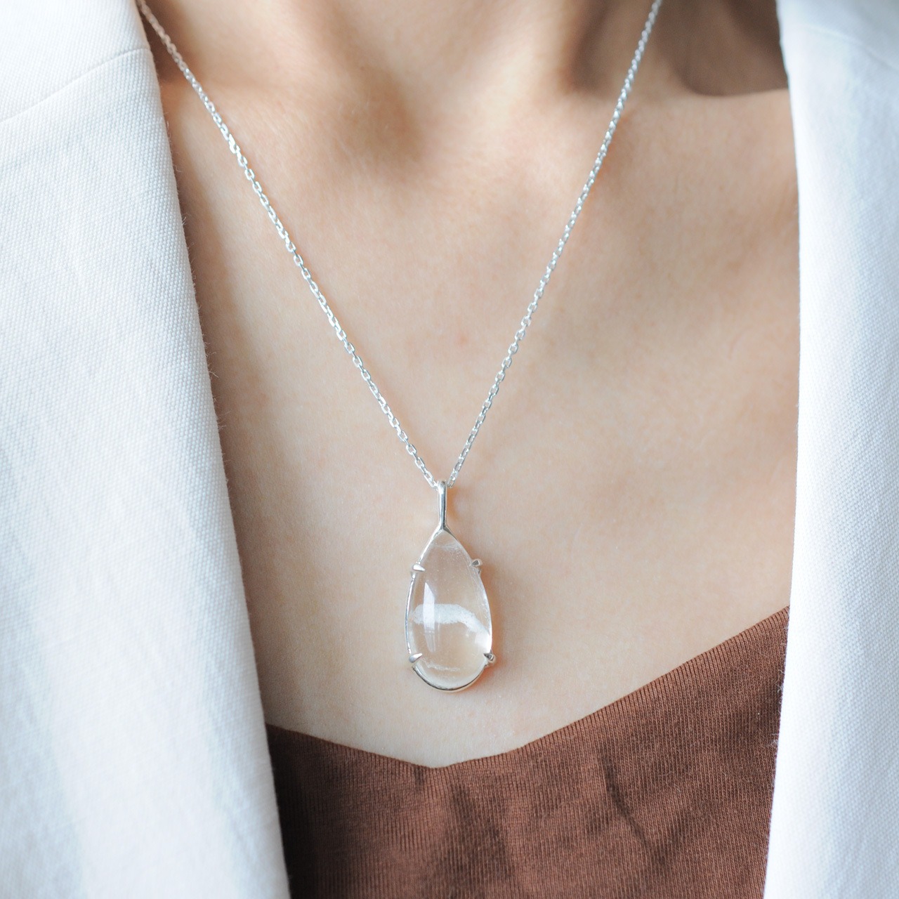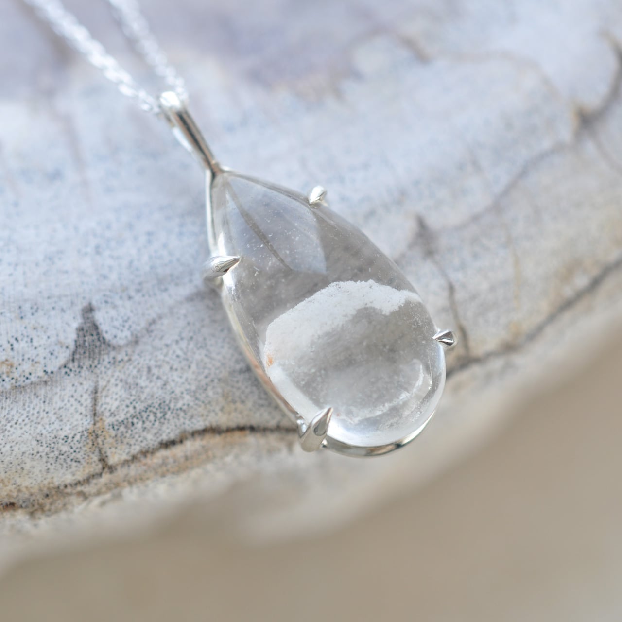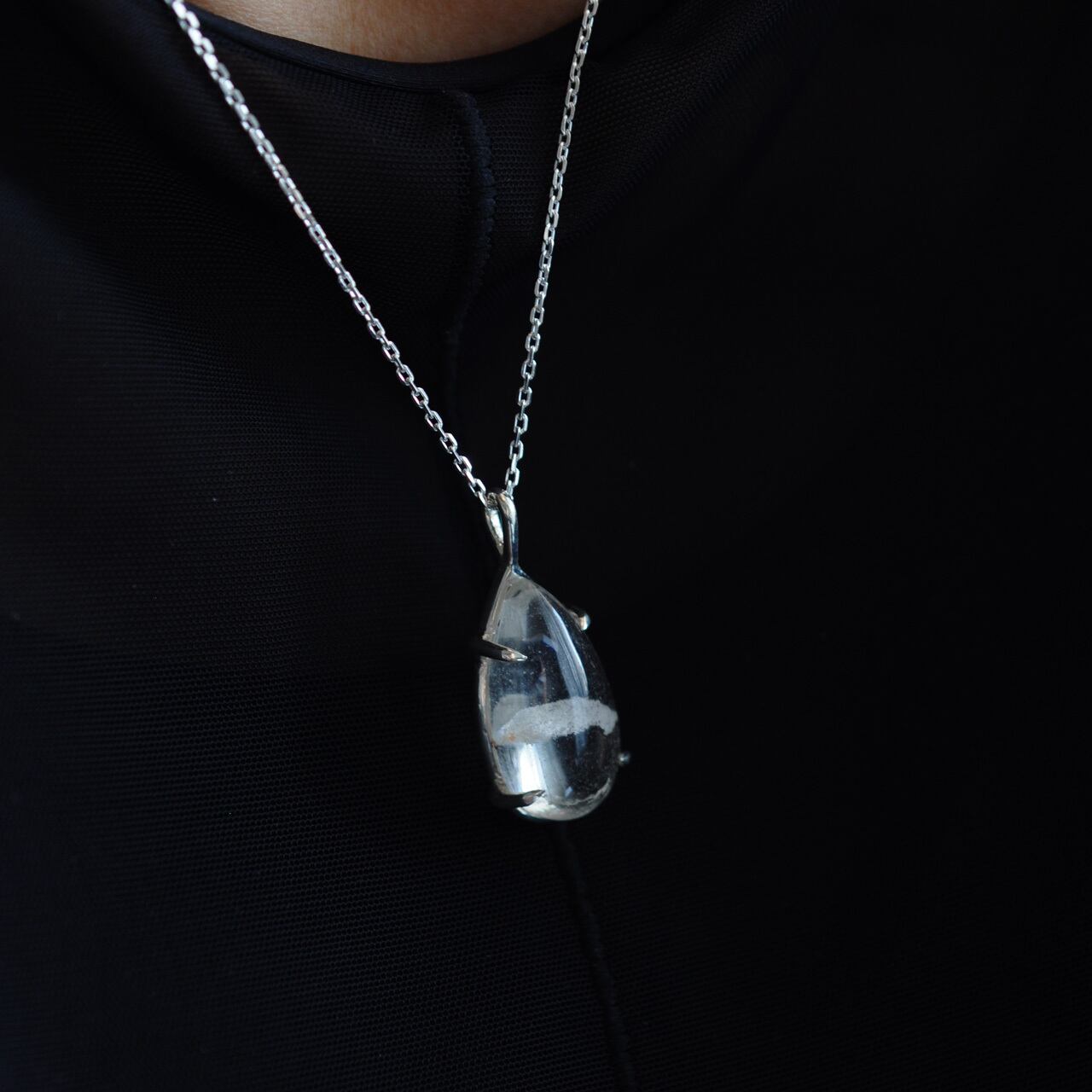 雪景色を閉じ込めたスノードームのように、静けさと奥行きを感じさせるネックレスです。