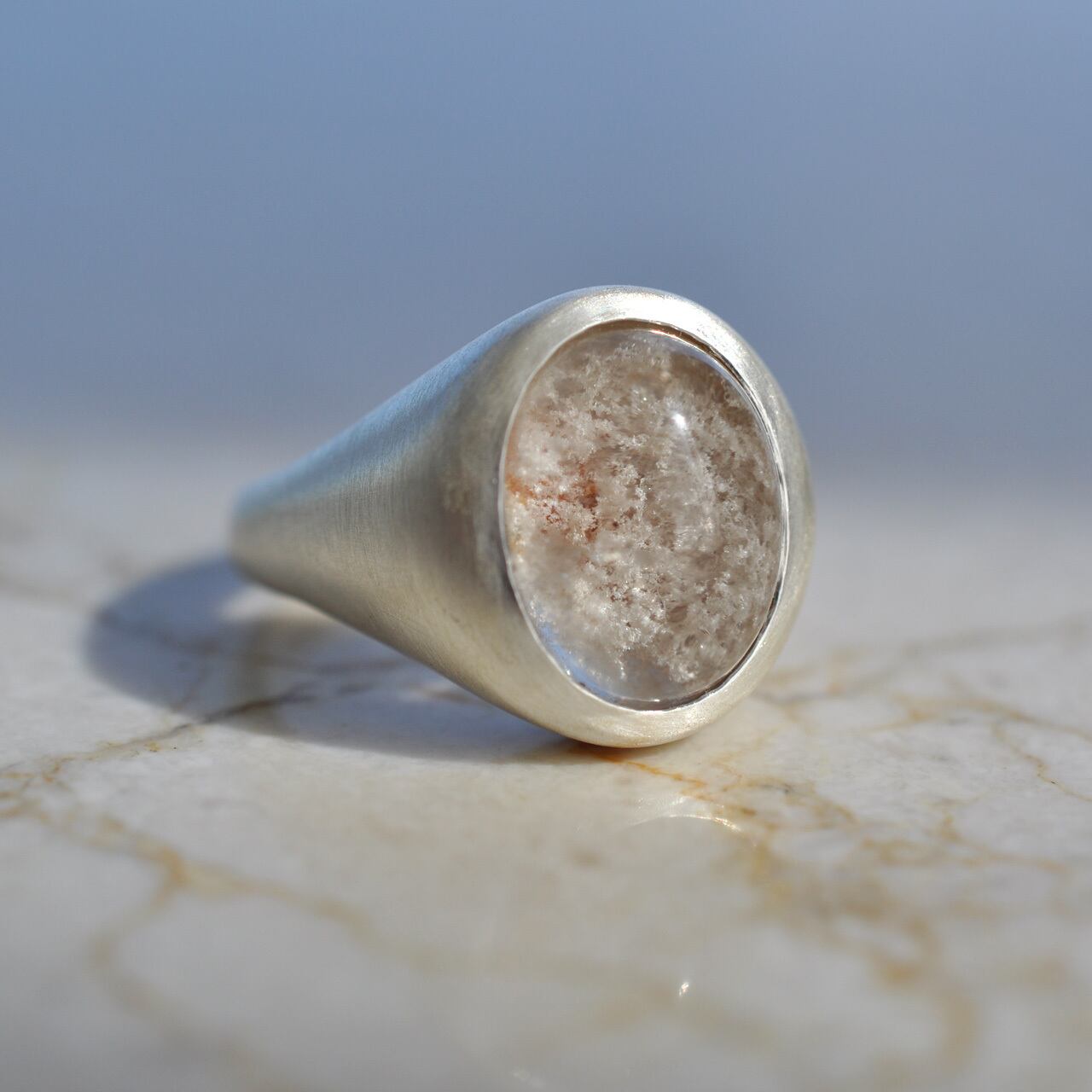 マットに仕立てたシルバーが石の透明感をやわらかく包み込み、指先にそっと、あたたかさと静けさを宿すリングに仕上げました。