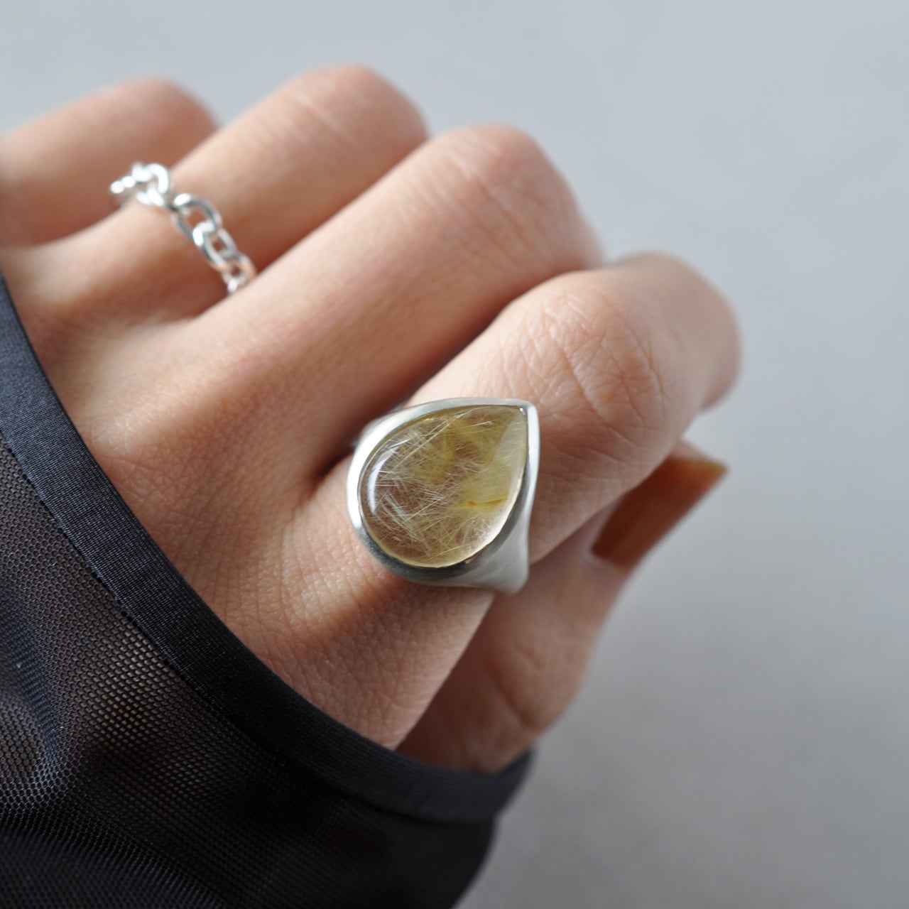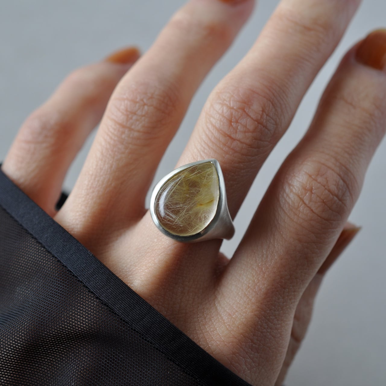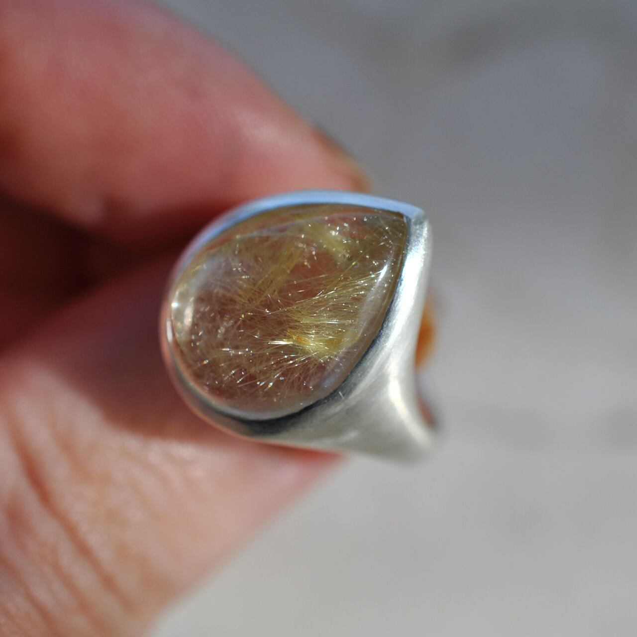 透明感のある水晶の奥で浮かぶ金の糸が光を受けて煌めき、マット仕上げのシルバーがその輝きをやわらかく包み込みます。