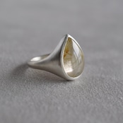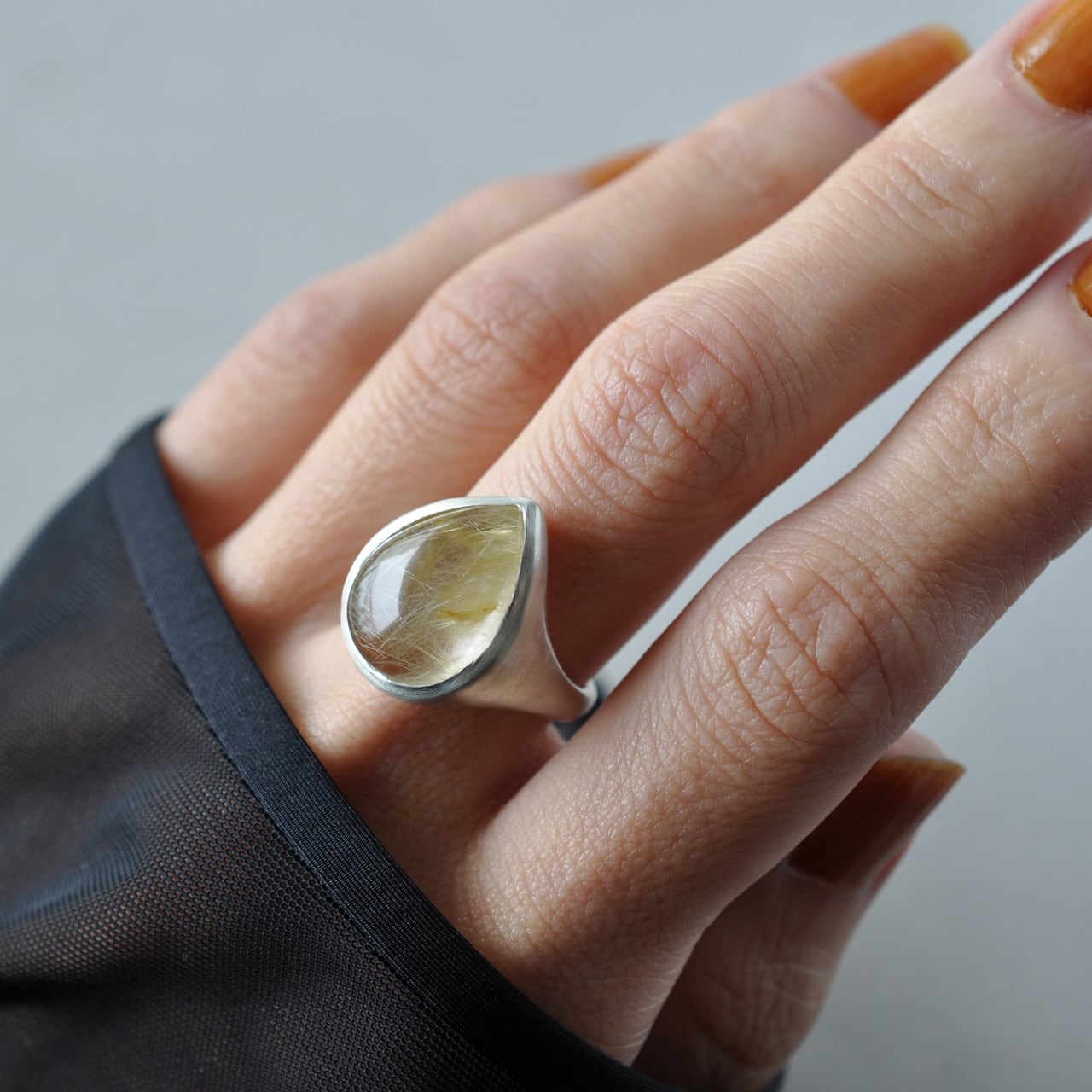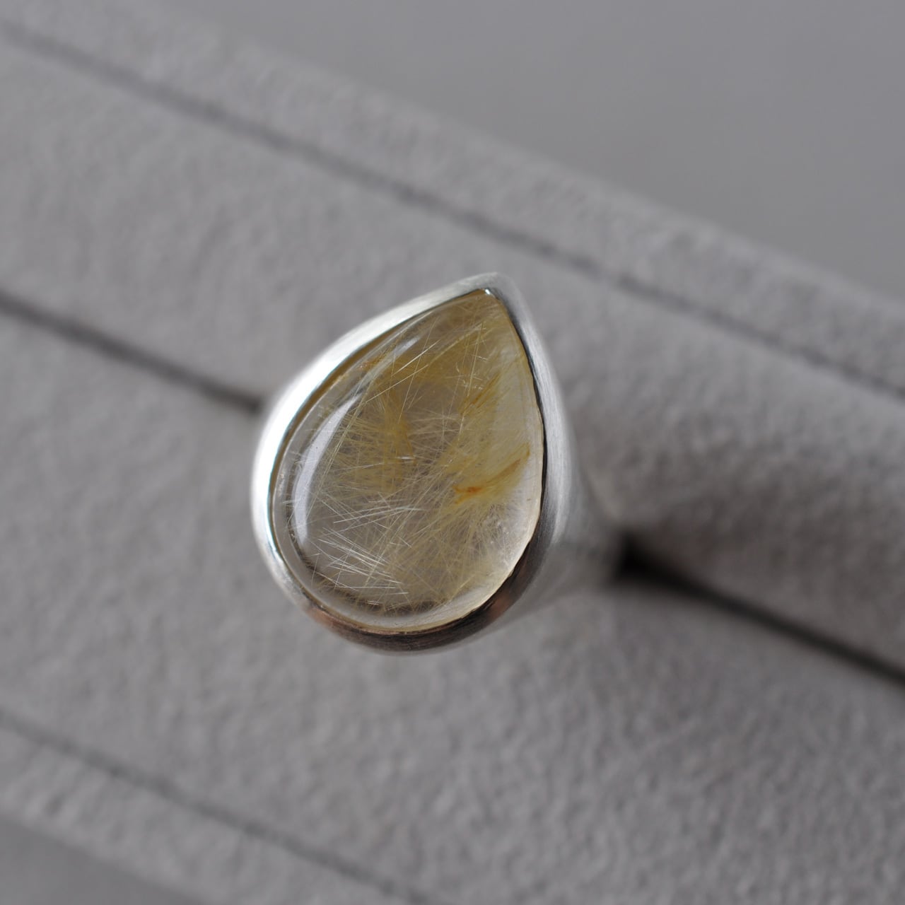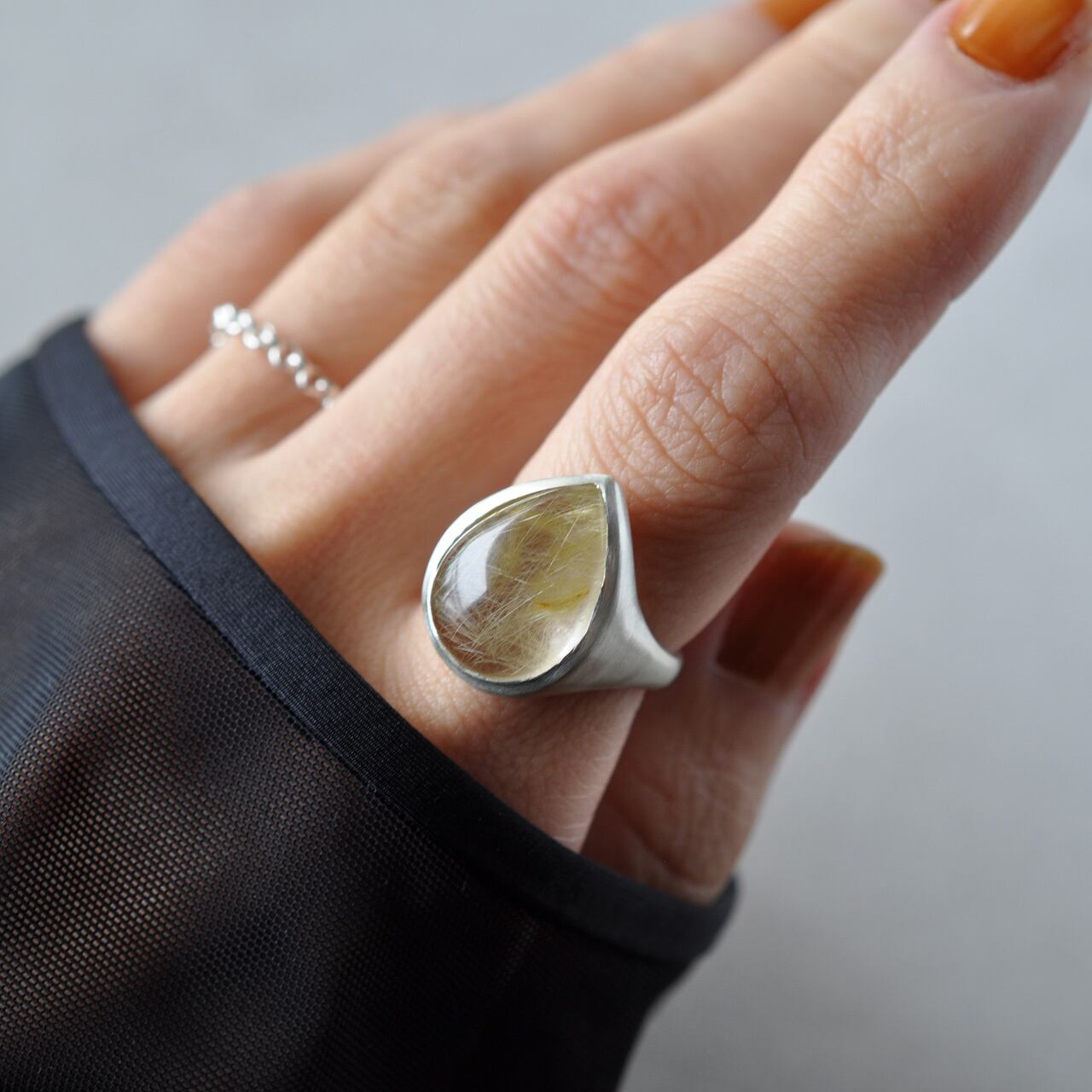 透明感のある水晶の奥で浮かぶ金の糸が光を受けて煌めき、マット仕上げのシルバーがその輝きをやわらかく包み込みます。