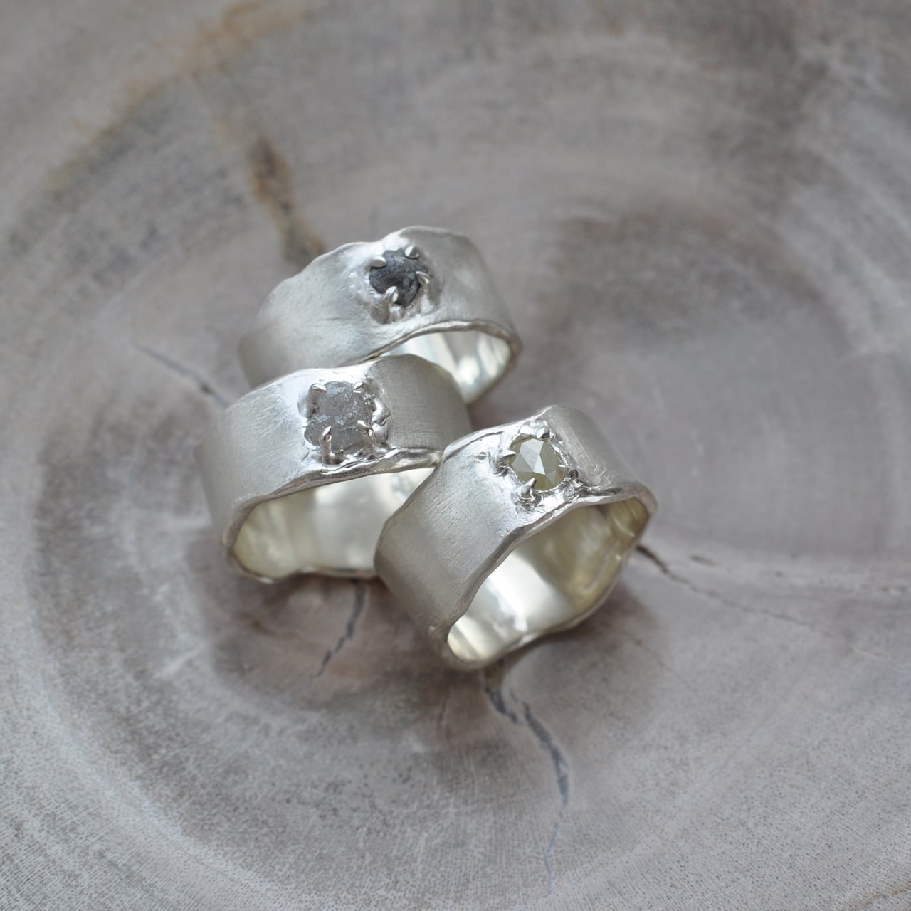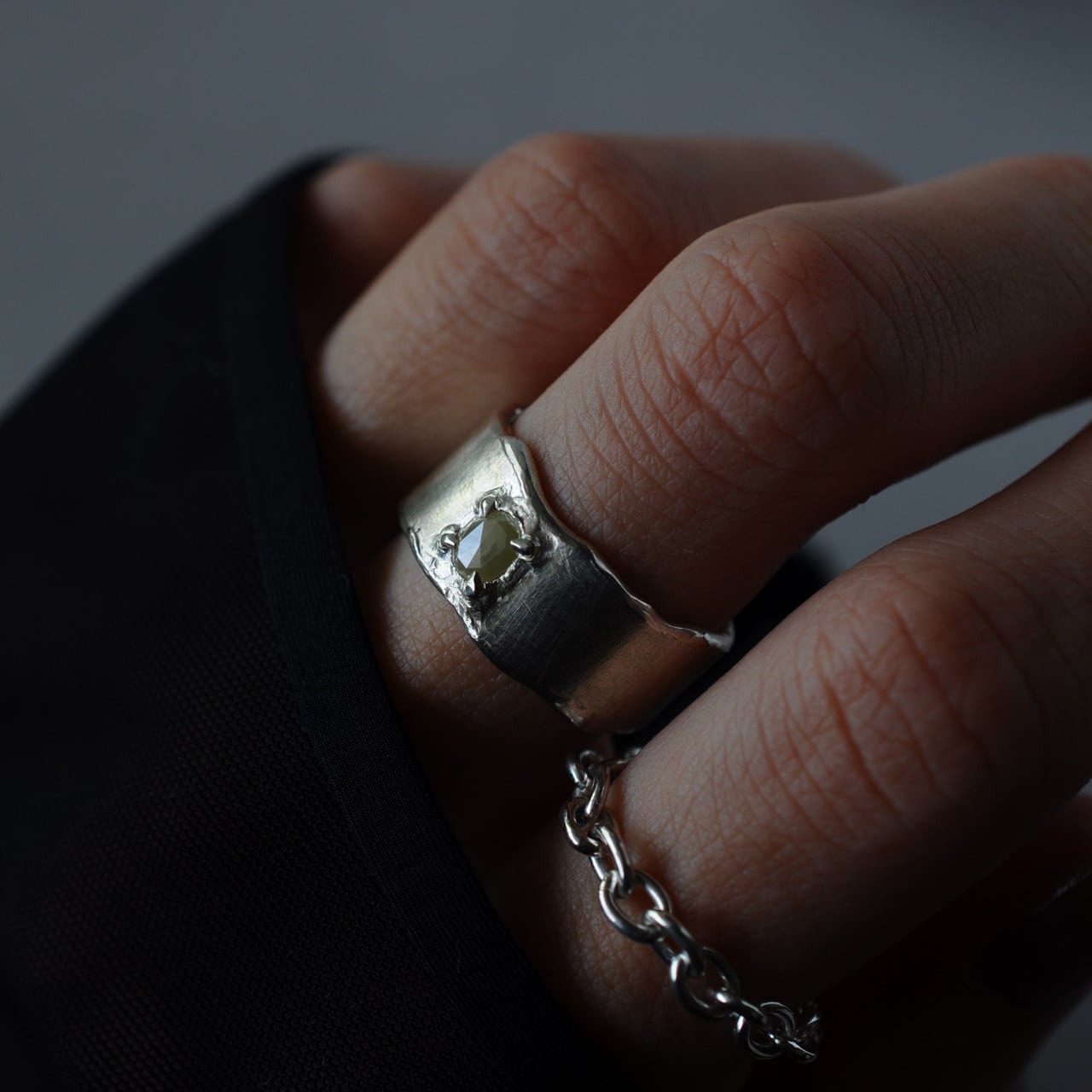 ローズカットが施されたダイヤモンドが、無骨なシルバーの質感と調和しながらも、光を受けるたびに柔らかくほのかに輝きます。