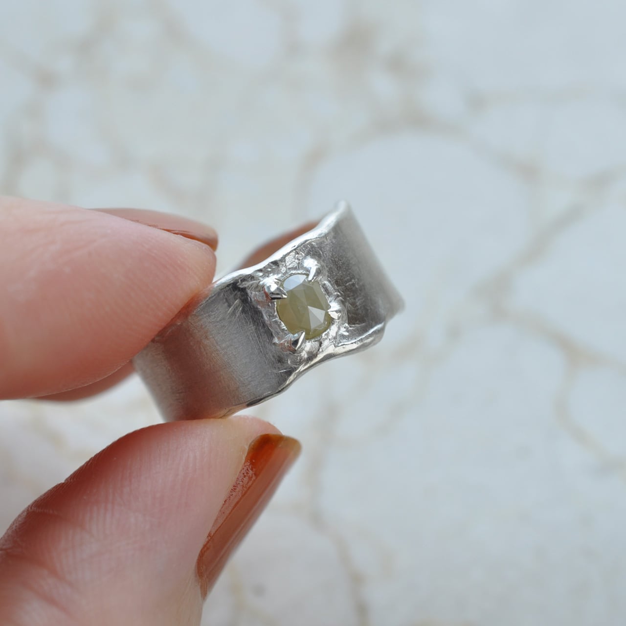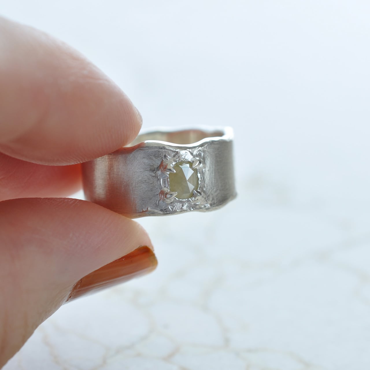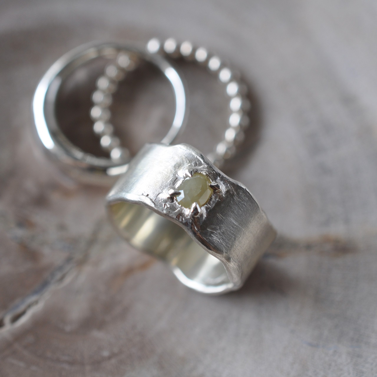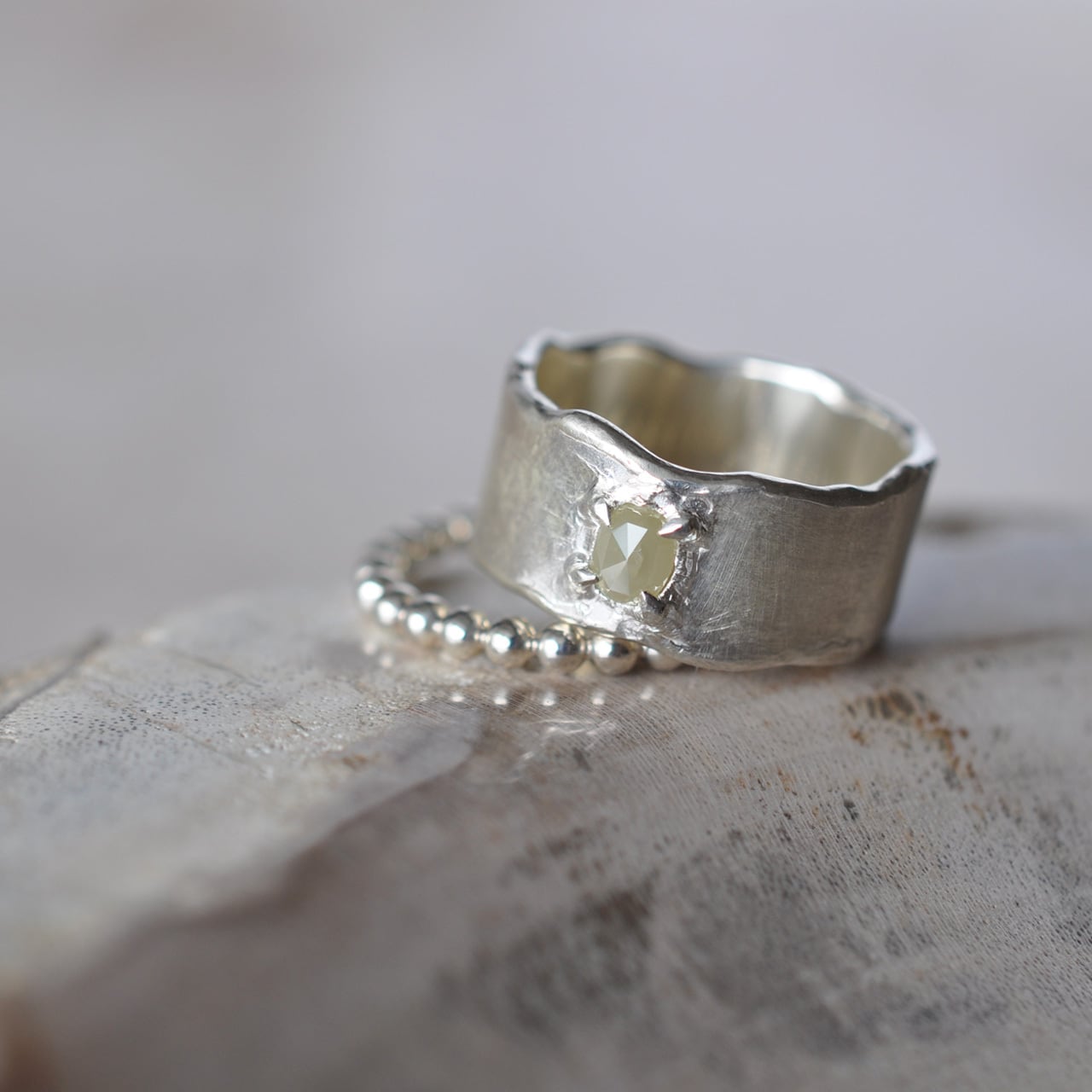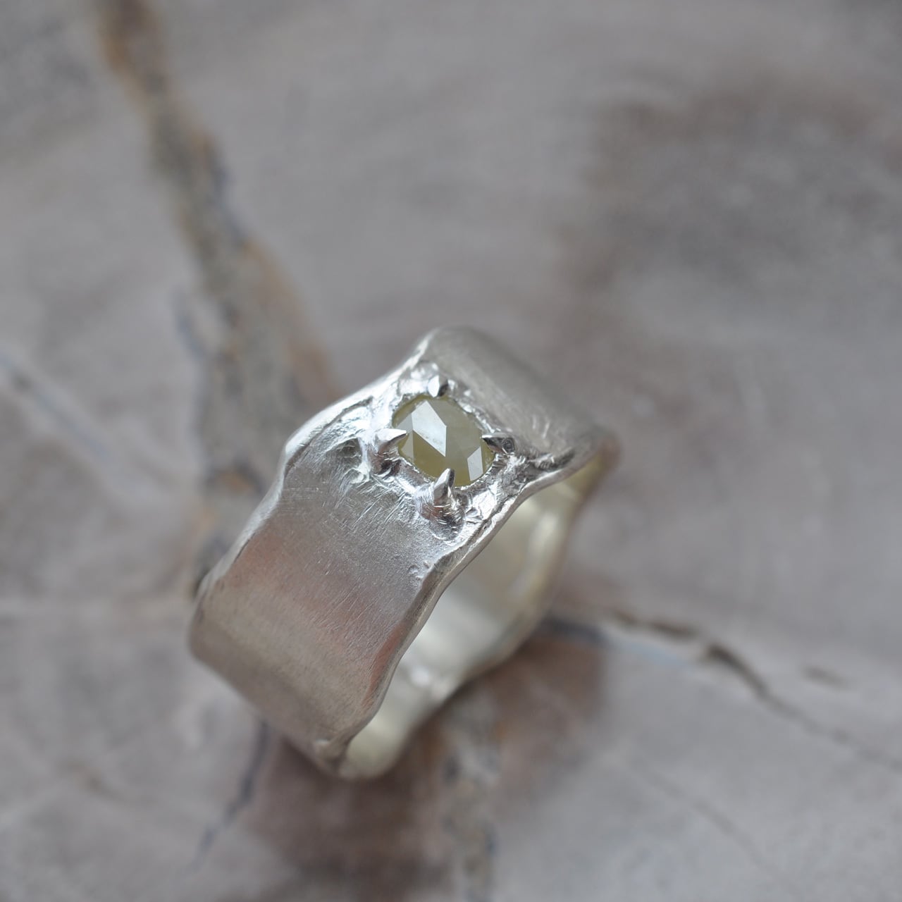 こちらは、優しいミルキーなイエローのナチュラルダイヤモンドを留めたシルバーワイドリング。