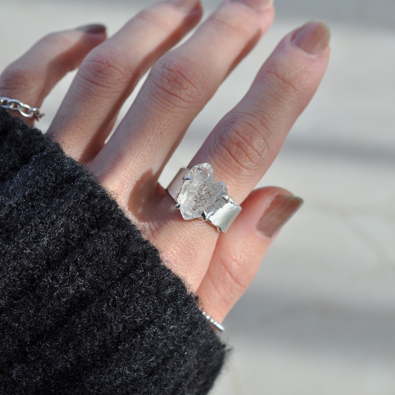 カットされた宝石にはない原石ならではの歪みや揺らぎが、甘すぎない大人の表情を魅せてくれます。