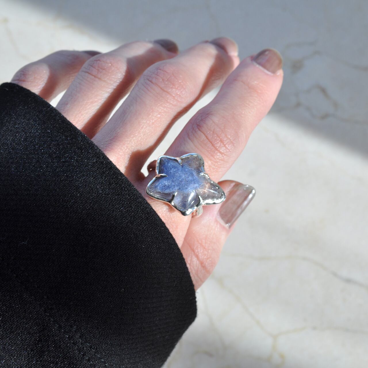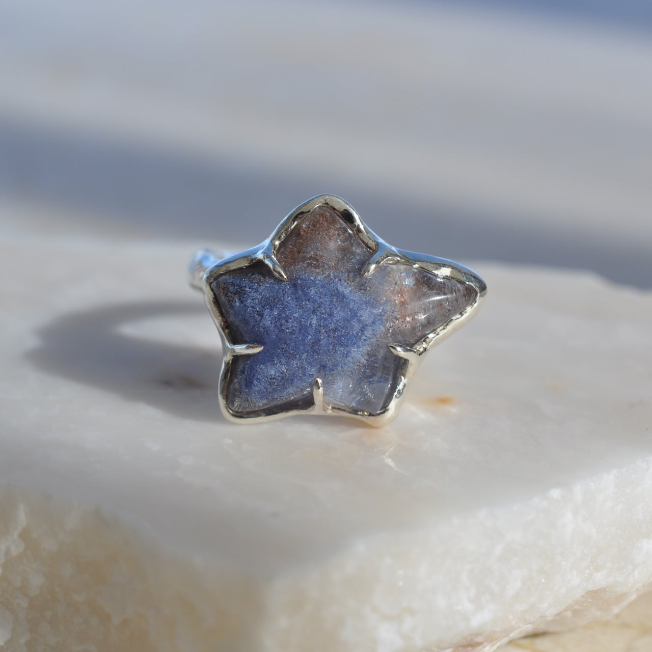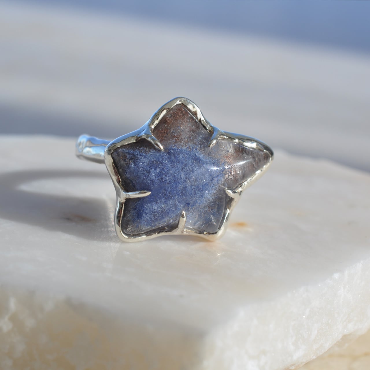 デュモルチェライトインクォーツを、愛らしい星形のリングに仕立てました。