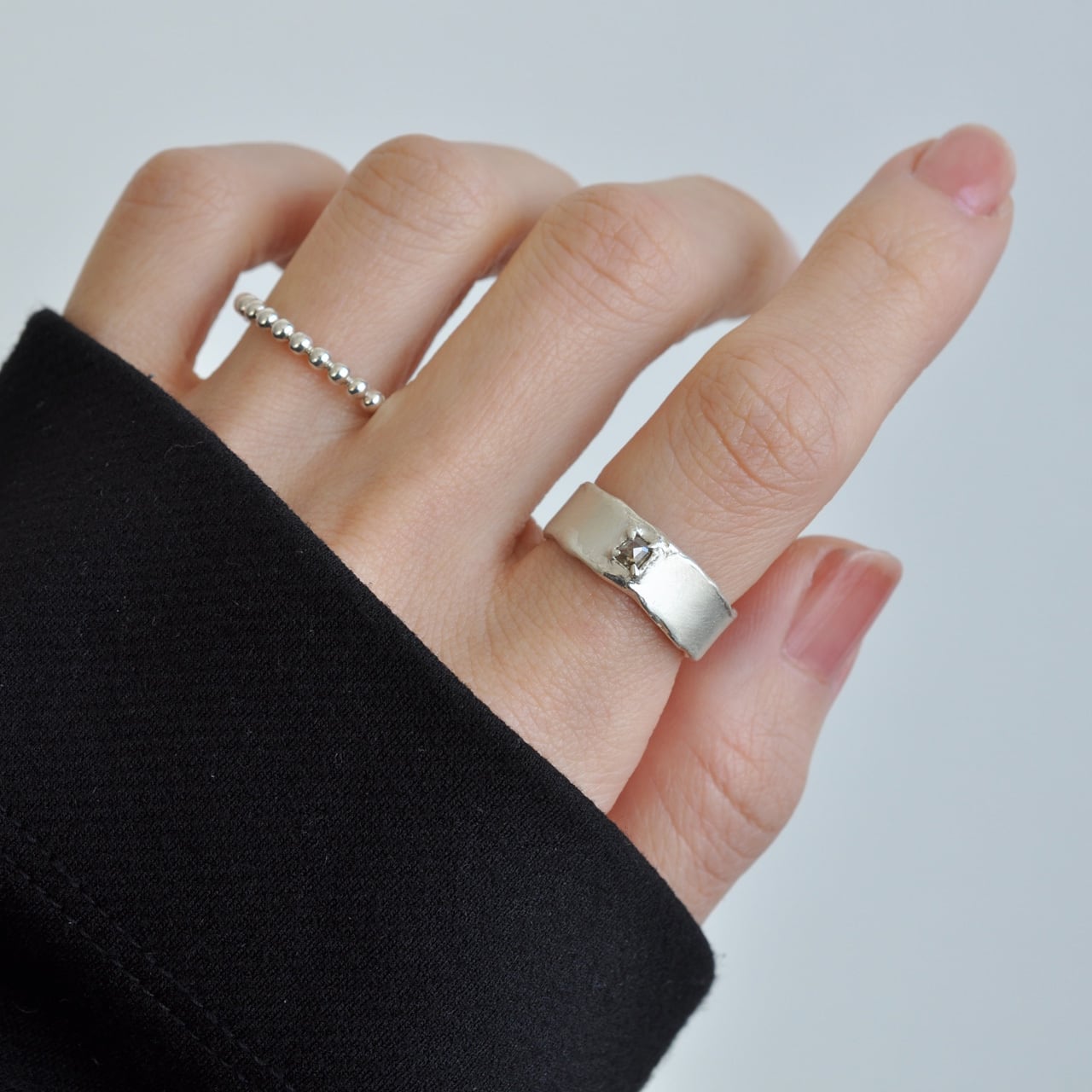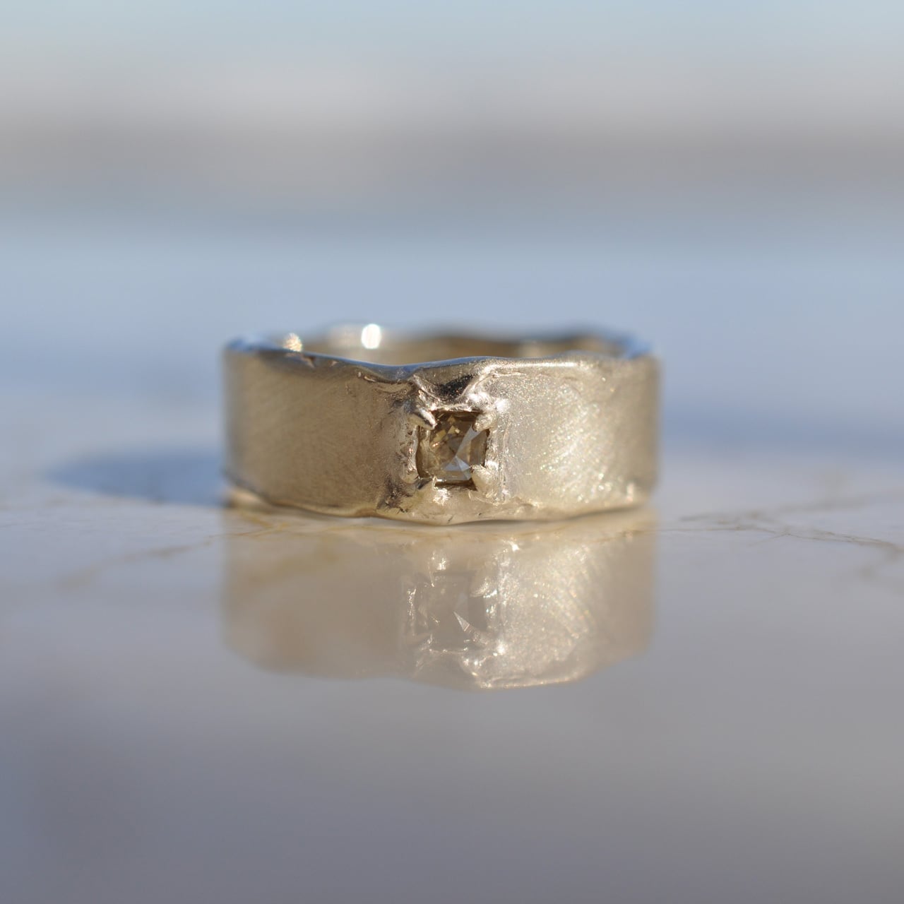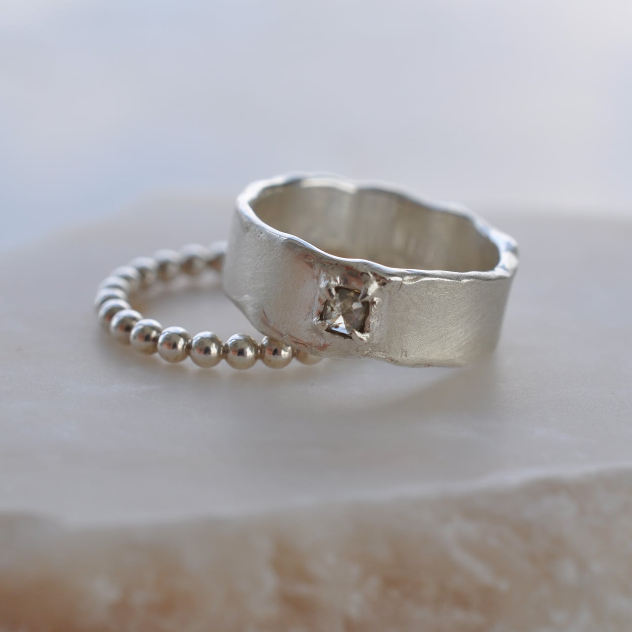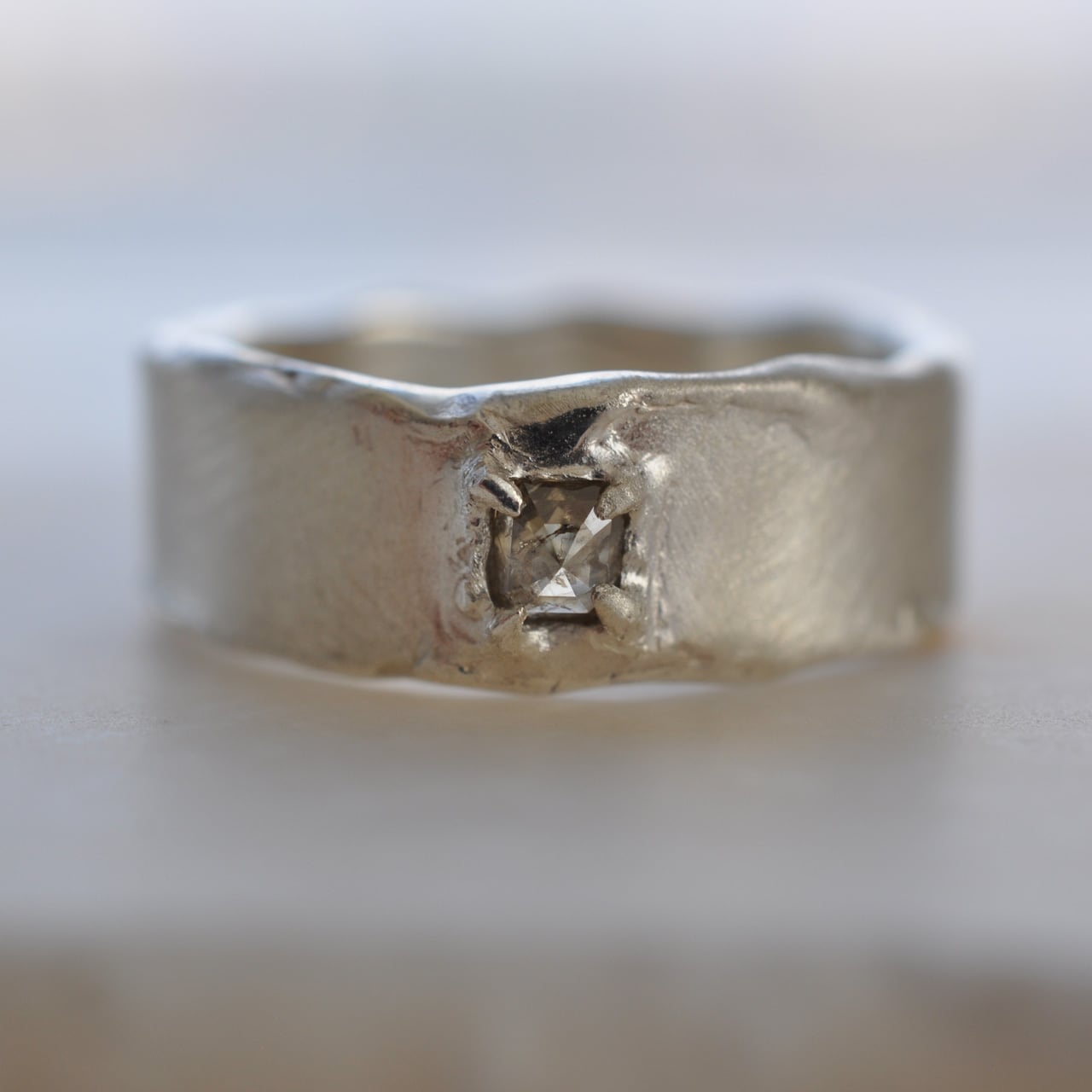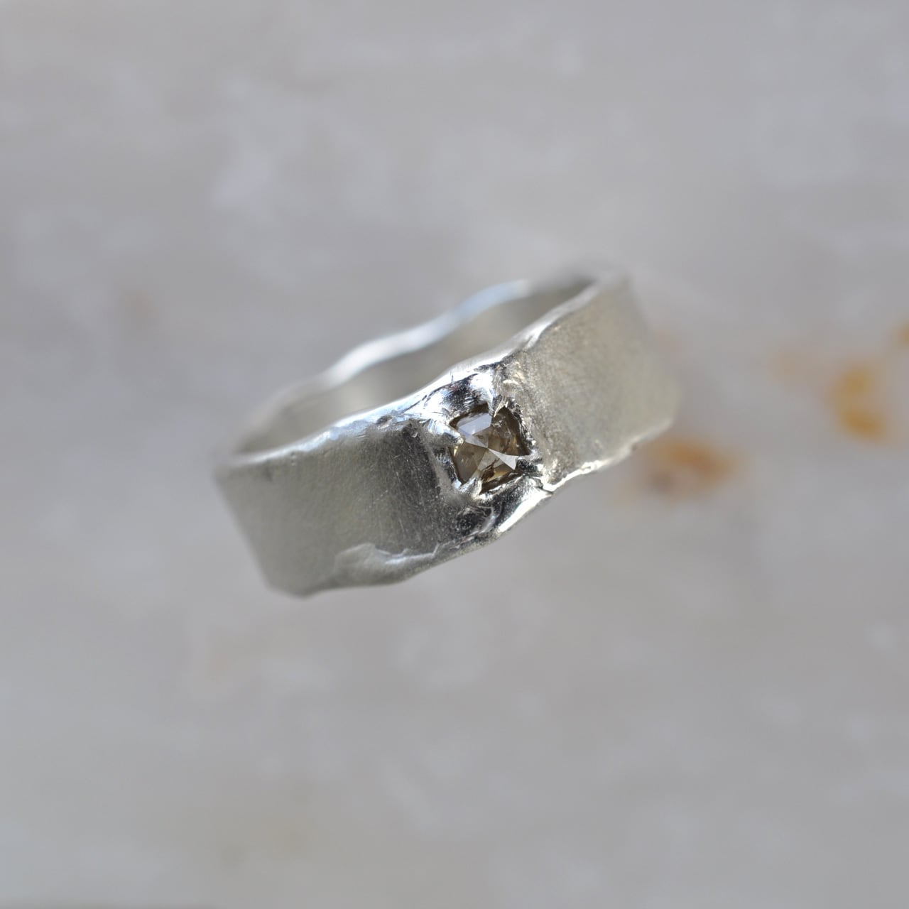 無骨なシルバーの質感に寄り添うようにセットされたダイヤモンドは、光を受けるたび静かに表情を変え、自然が生み出した独特の色合いと奥行きを感じさせてくれます。