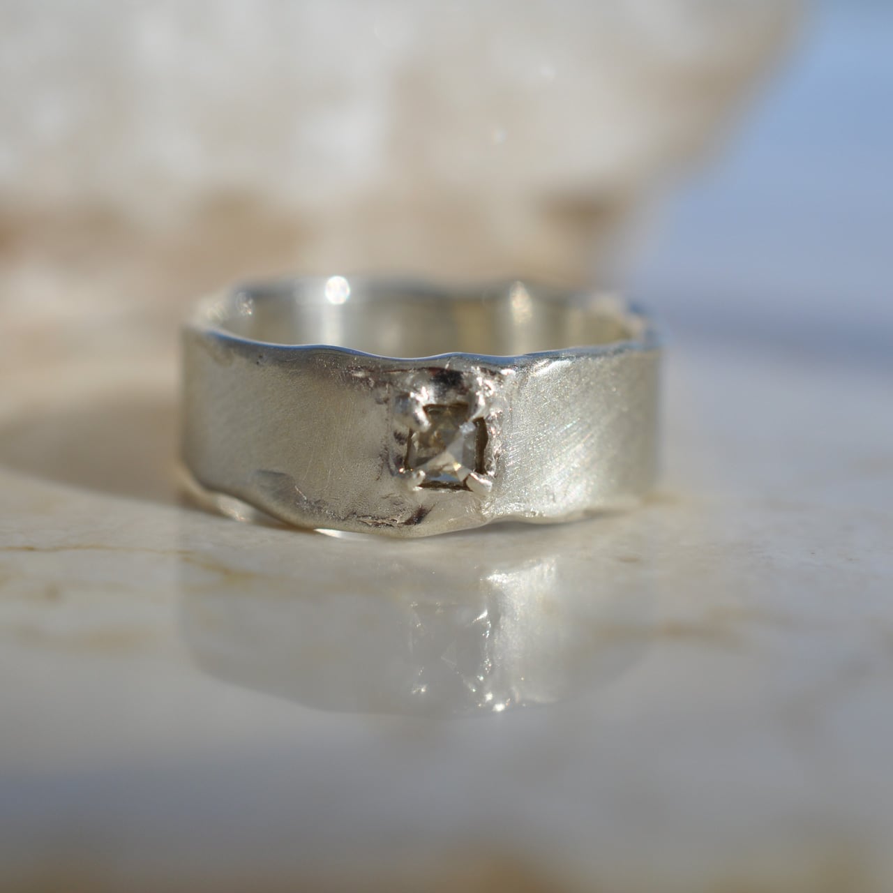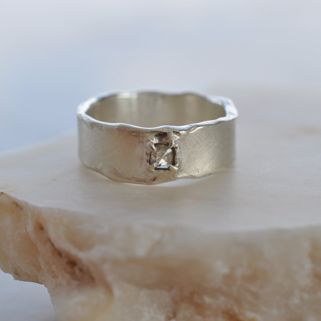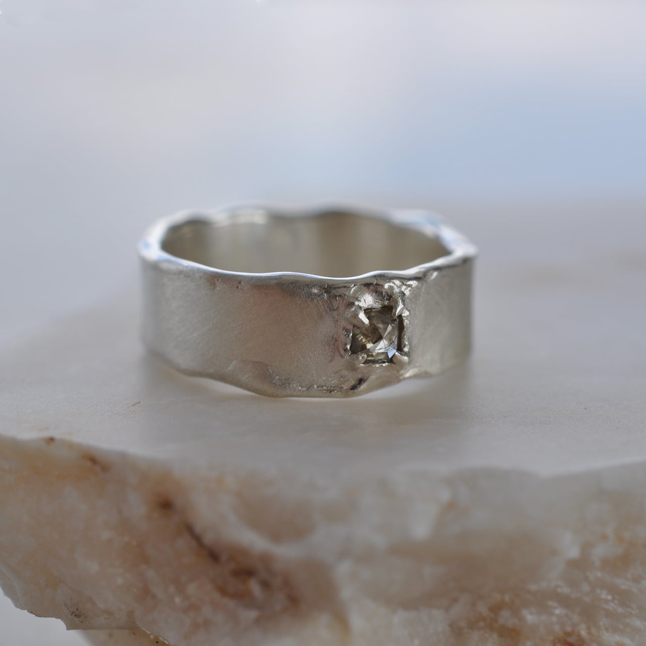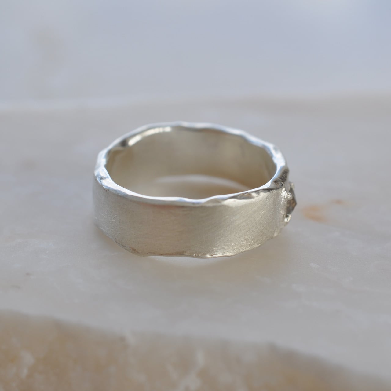 無骨なシルバーの質感に寄り添うようにセットされたダイヤモンドは、光を受けるたび静かに表情を変え、自然が生み出した独特の色合いと奥行きを感じさせてくれます。