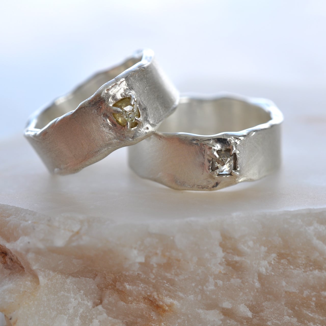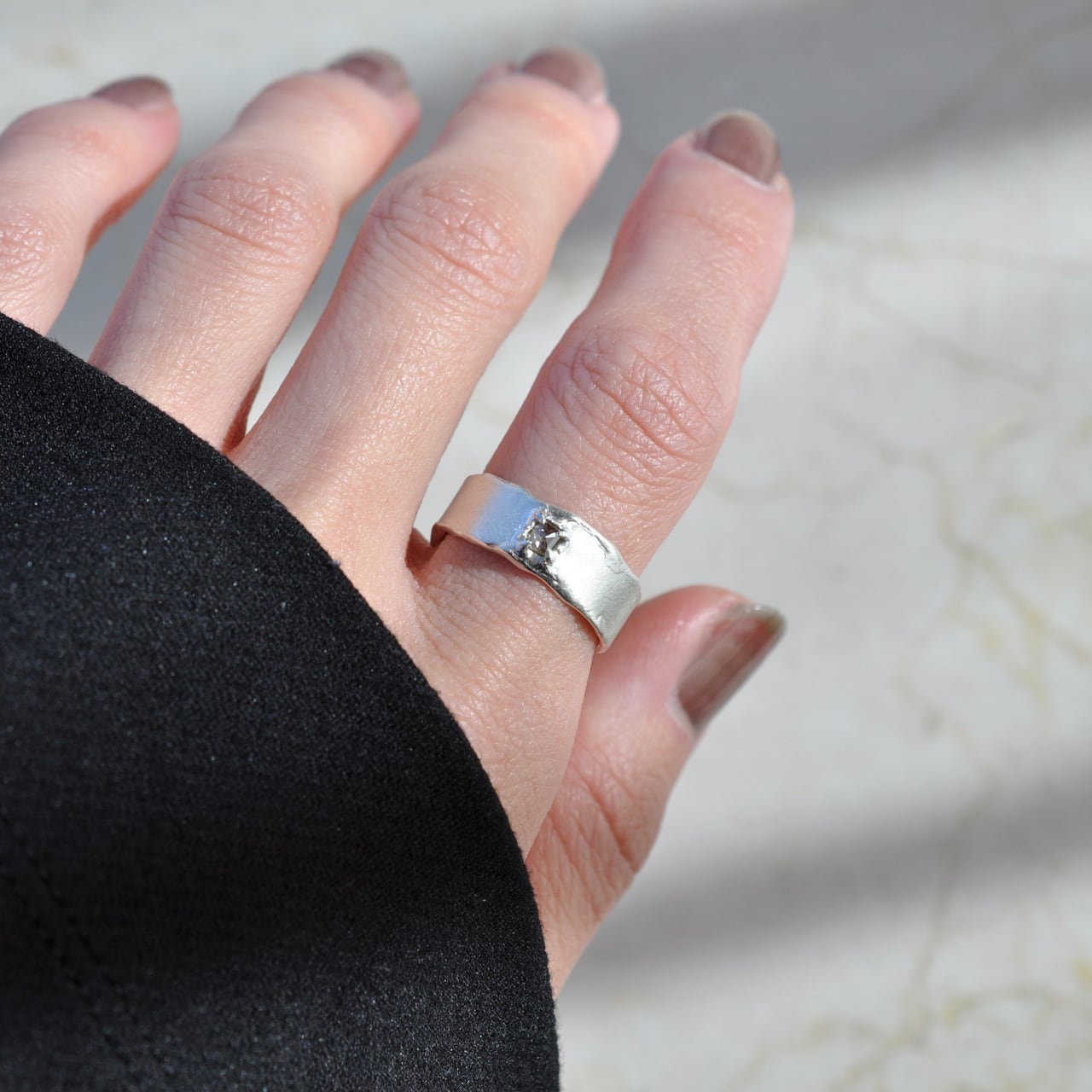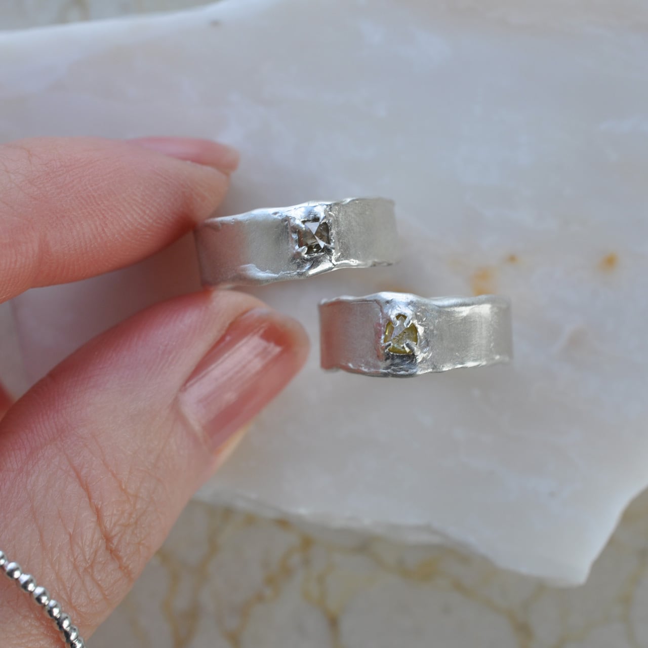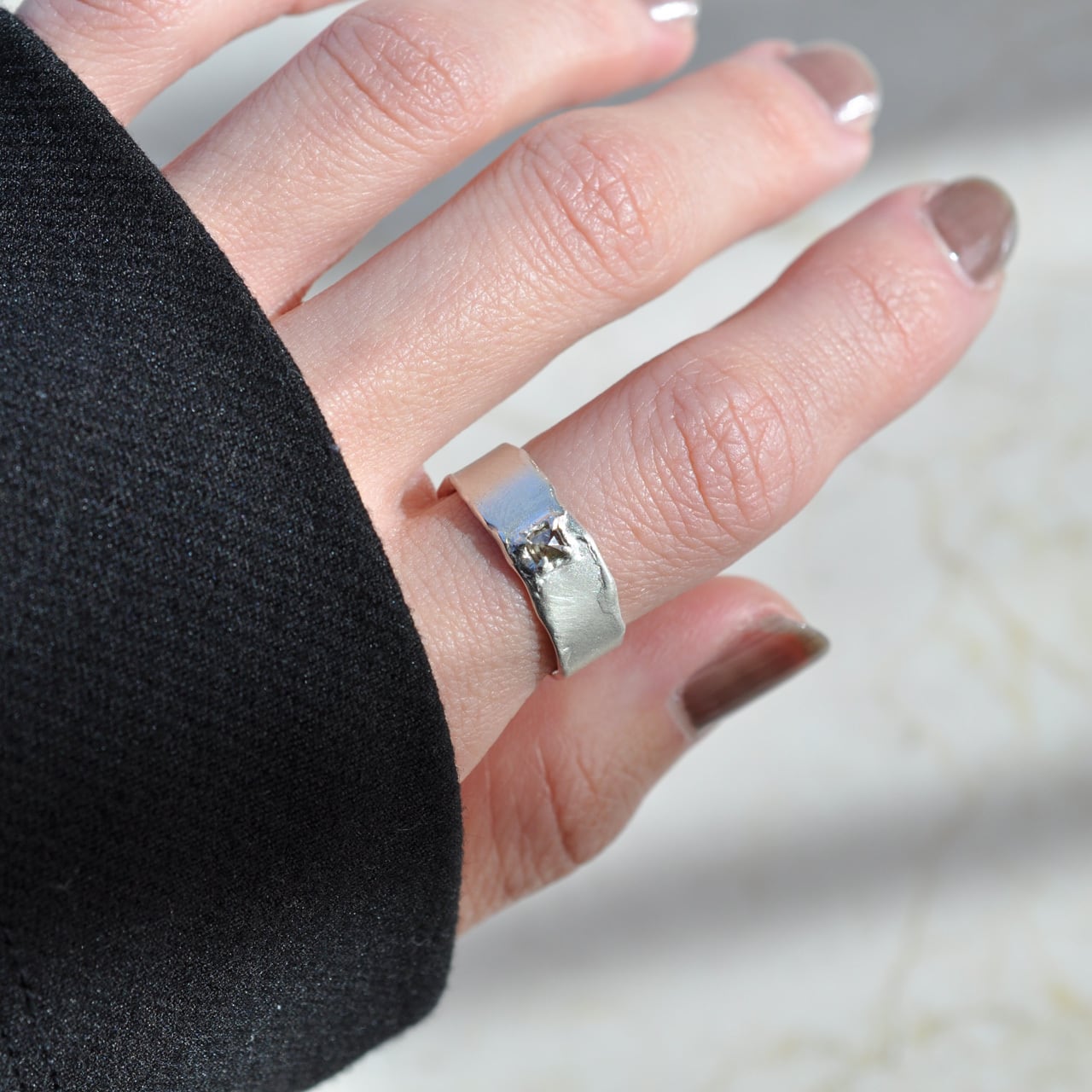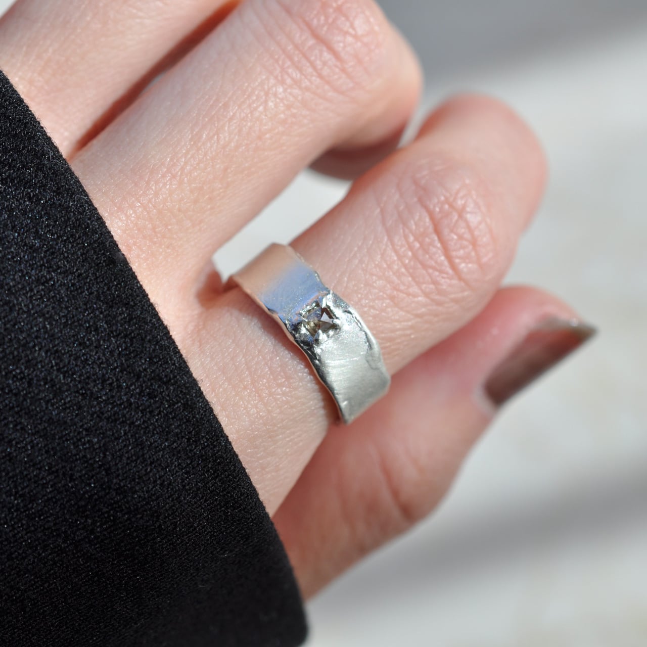 無骨なシルバーの質感に寄り添うようにセットされたダイヤモンドは、光を受けるたび静かに表情を変え、自然が生み出した独特の色合いと奥行きを感じさせてくれます。