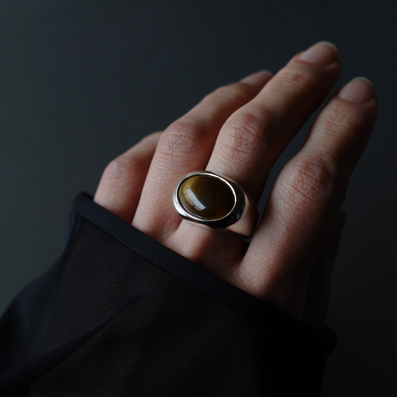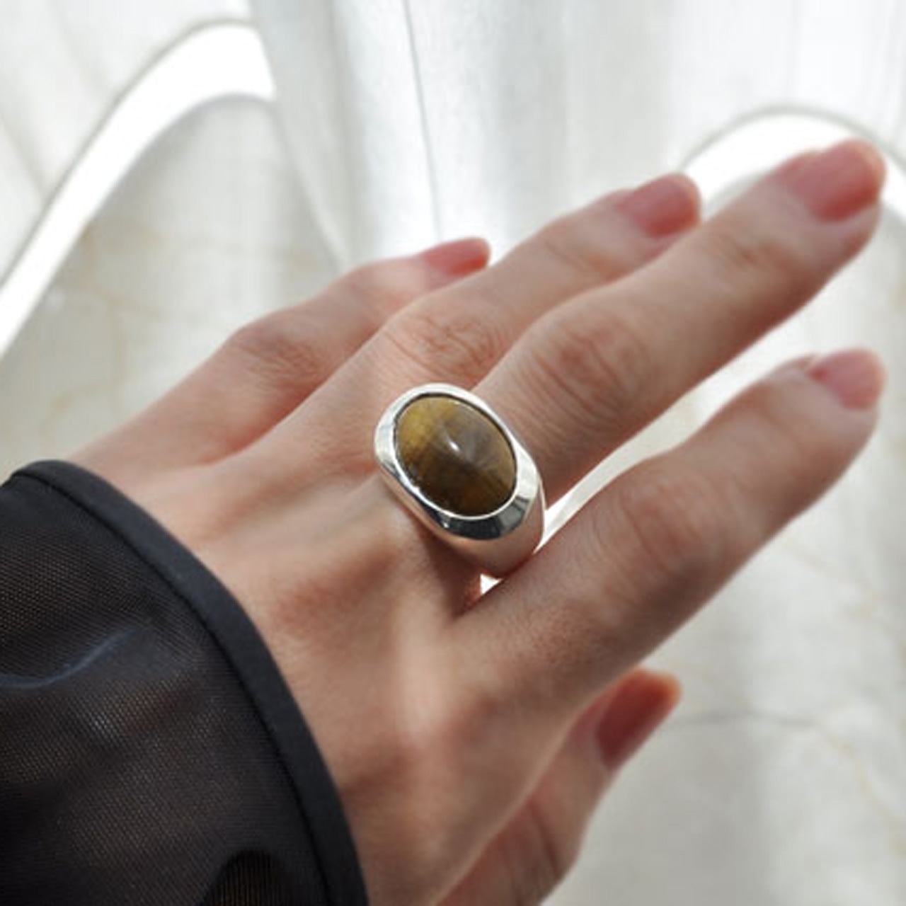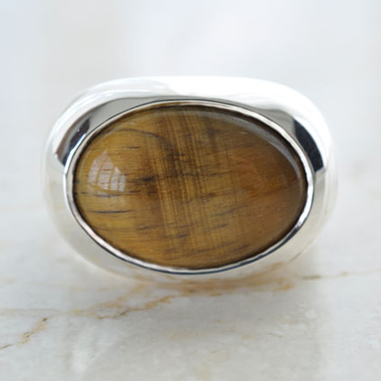スターリングシルバーにタイガーアイをセットした1点物の天然石ボリュームリング。