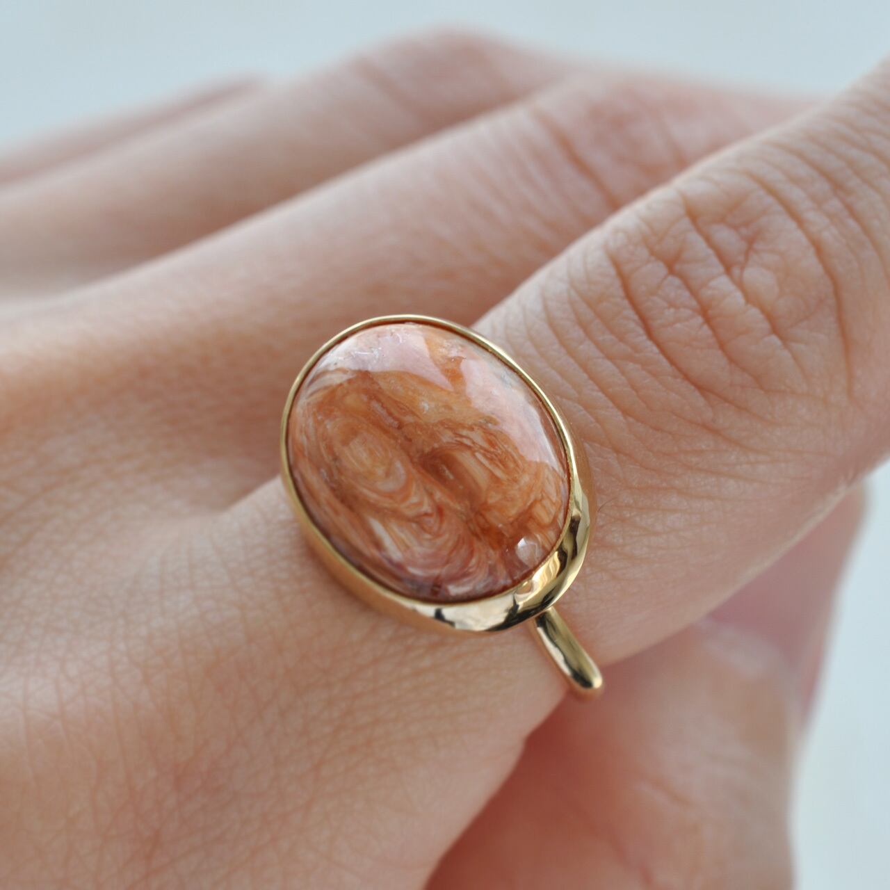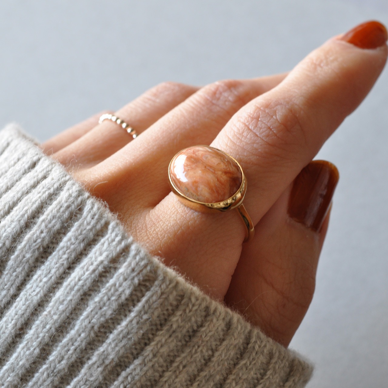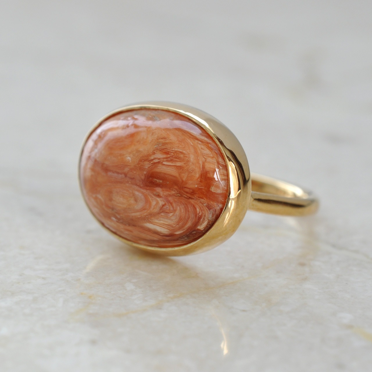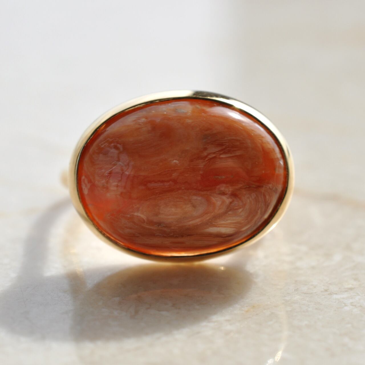 こっくりとしたキャラメルのような天然石を彫金の技法にてシンプルな覆輪のリングに仕立てました。
