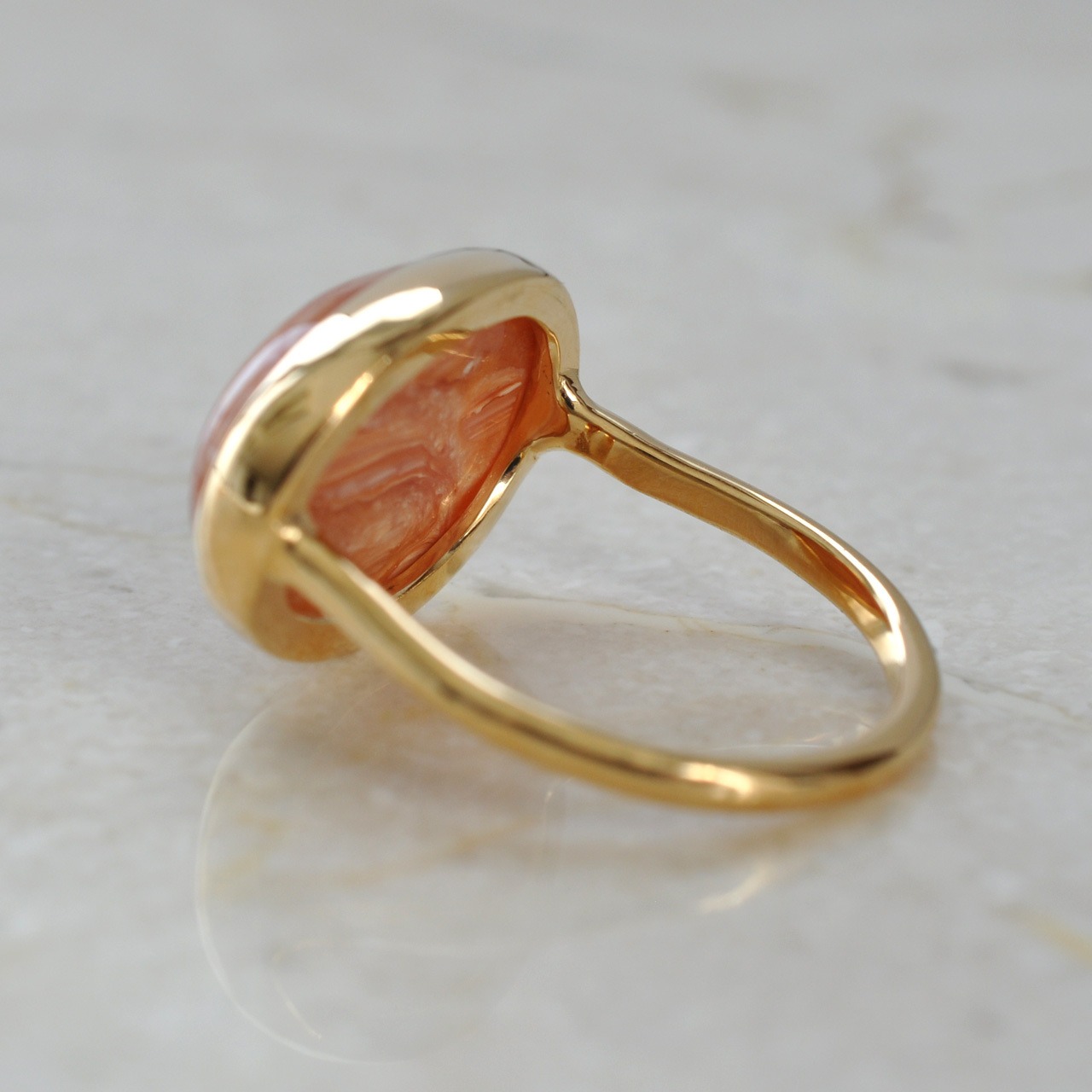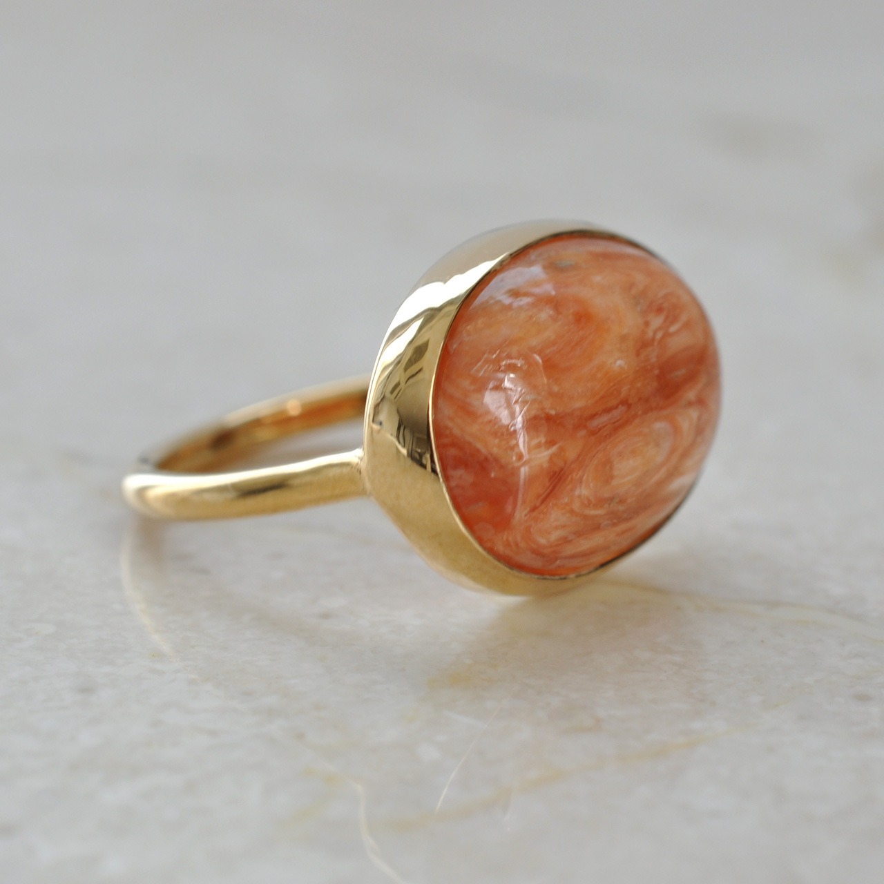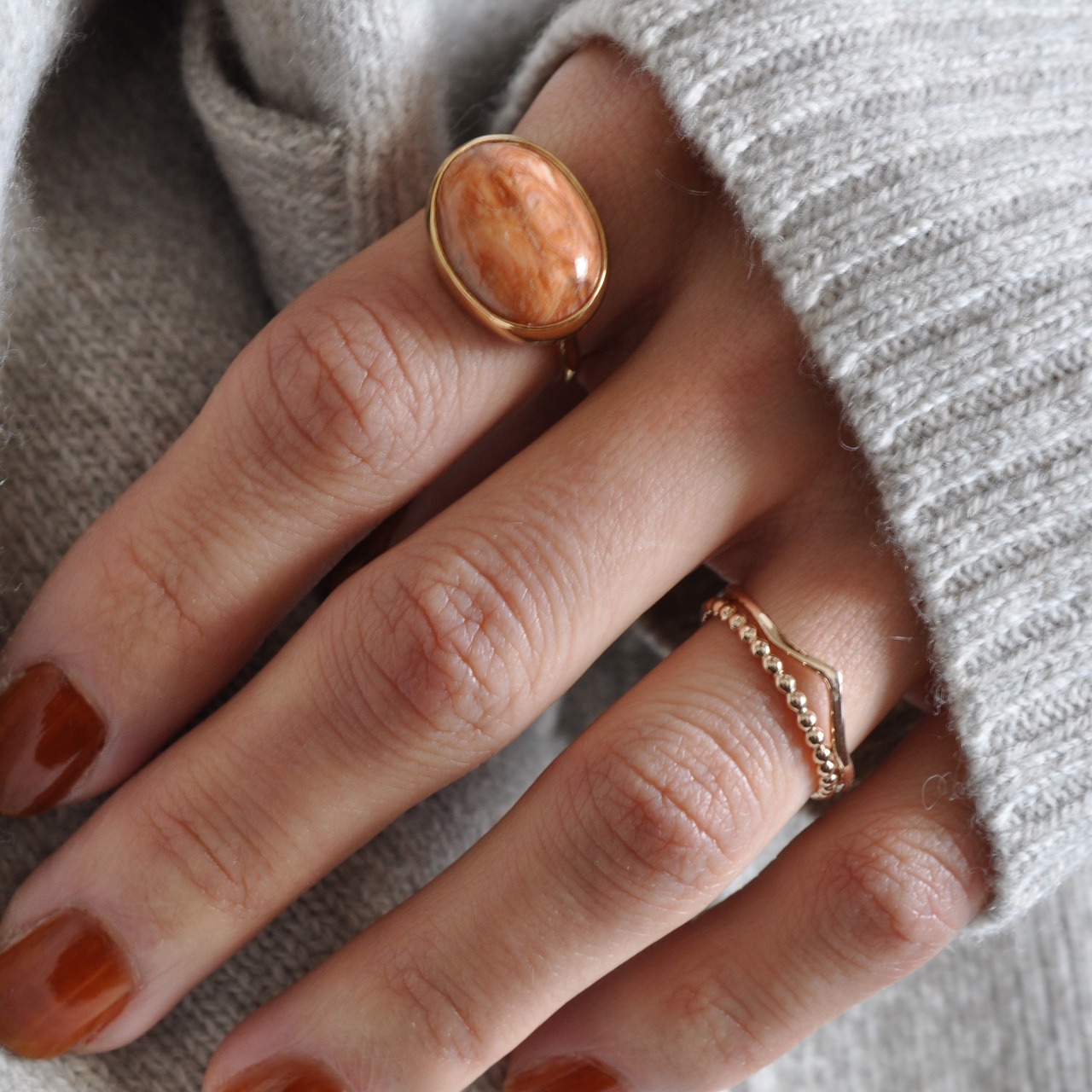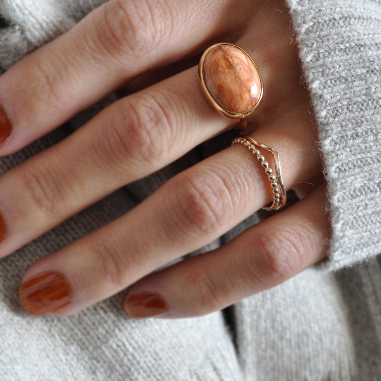 こっくりとしたキャラメルのような天然石を彫金の技法にてシンプルな覆輪のリングに仕立てました。