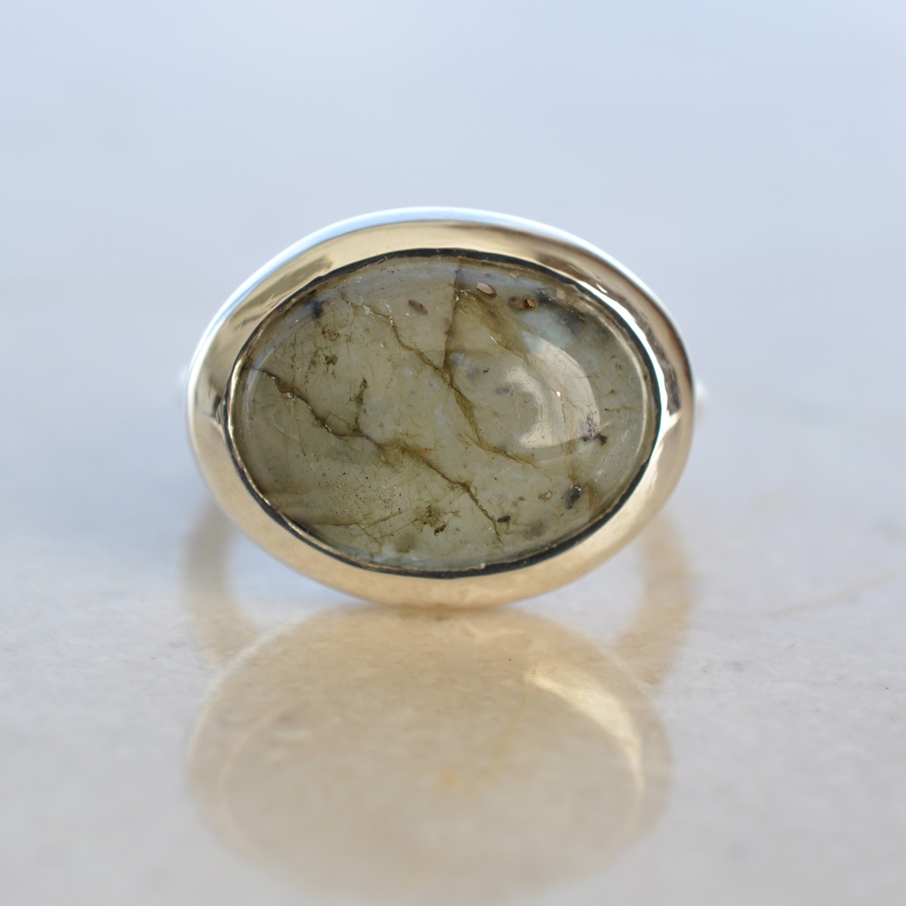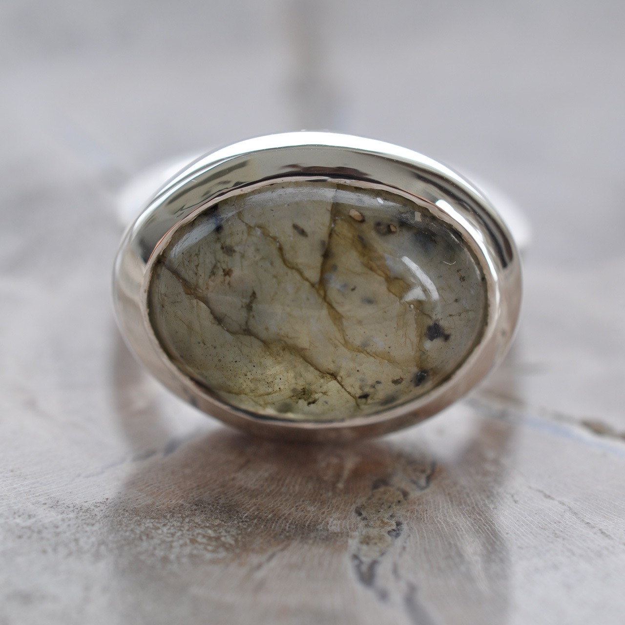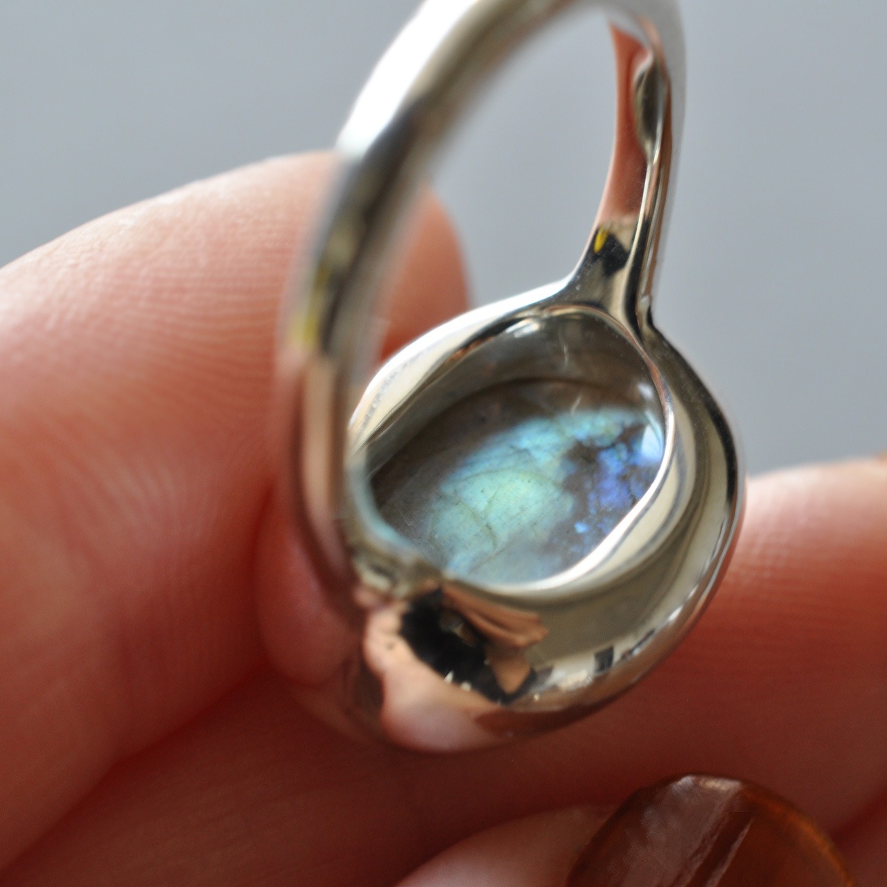 こちらはグレーベースにブラックの層がラインのように入っており落ち着いた色味をしておりますが、実は表ではなく裏側に虹色のラブラドレッセンスが浮かび上がります。