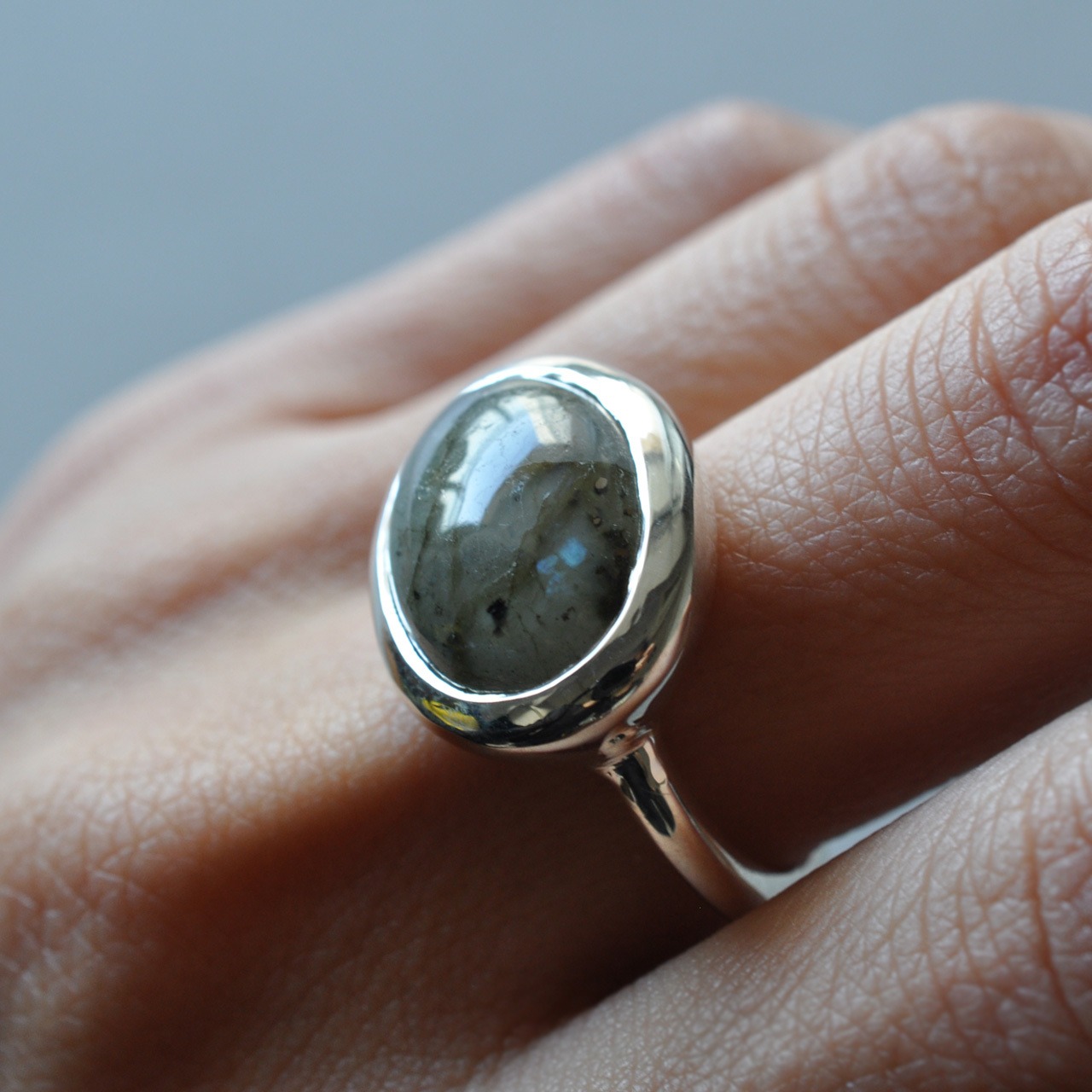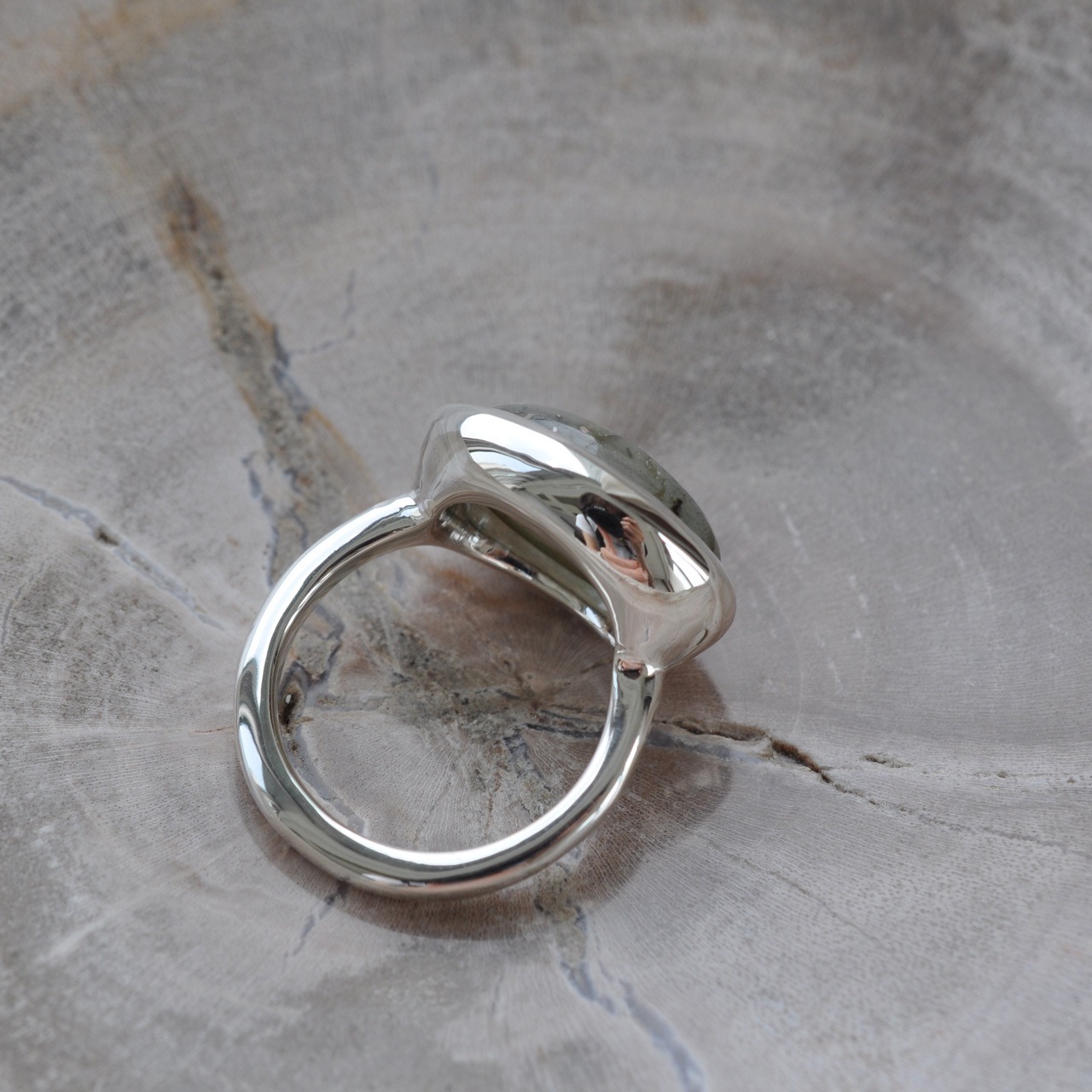 石の形に合わせて枠から作り、ころんとしたフォルムの覆輪リングに仕立てました。
