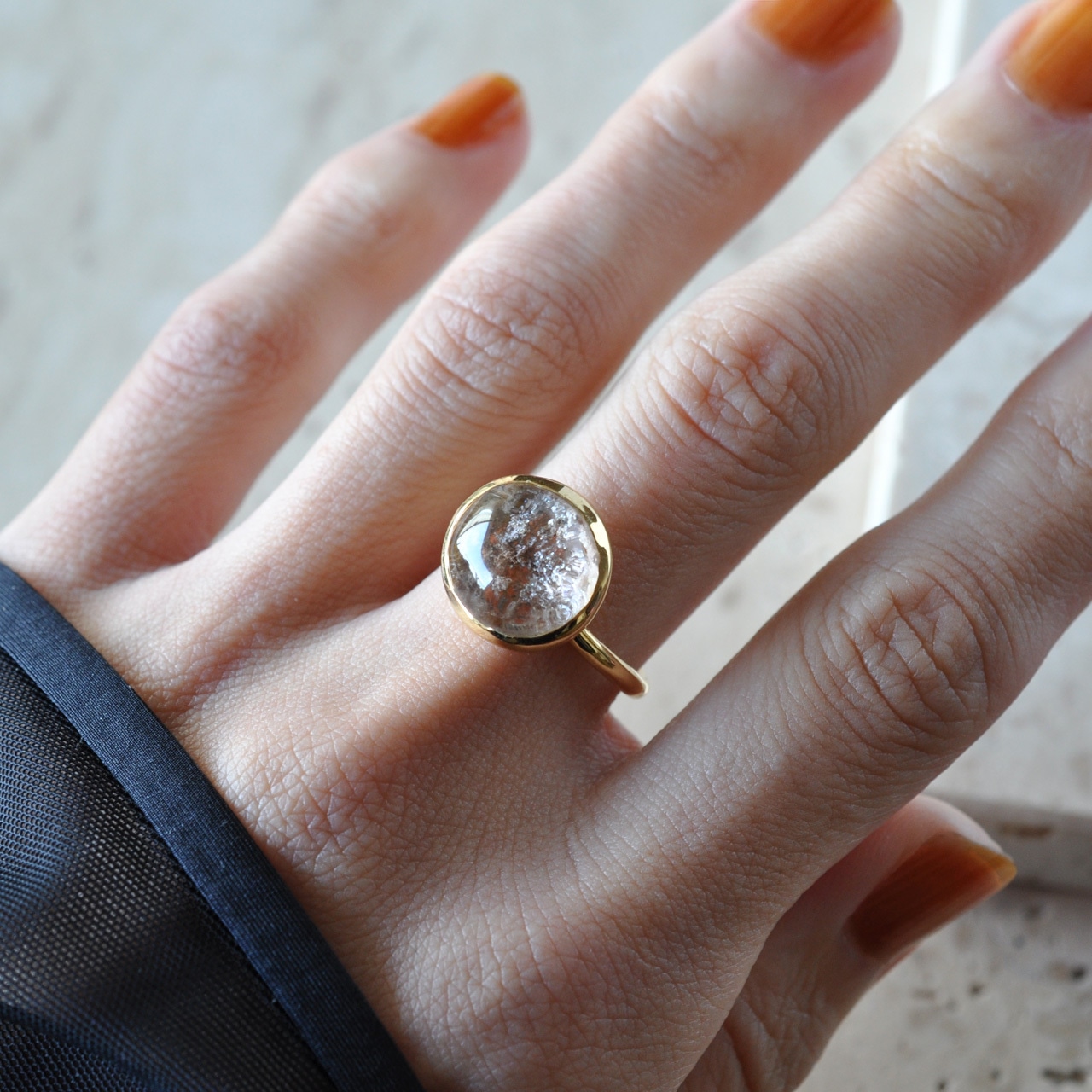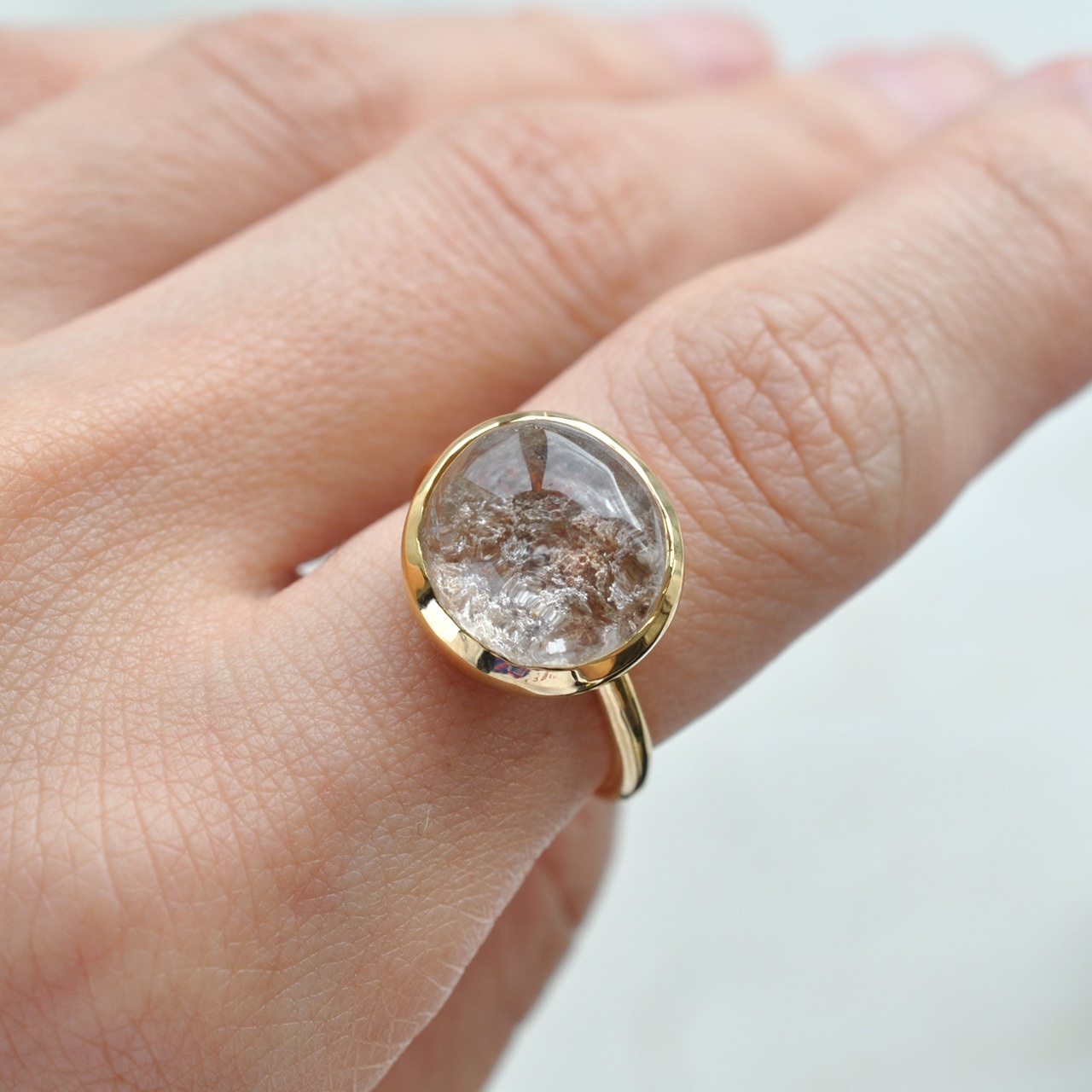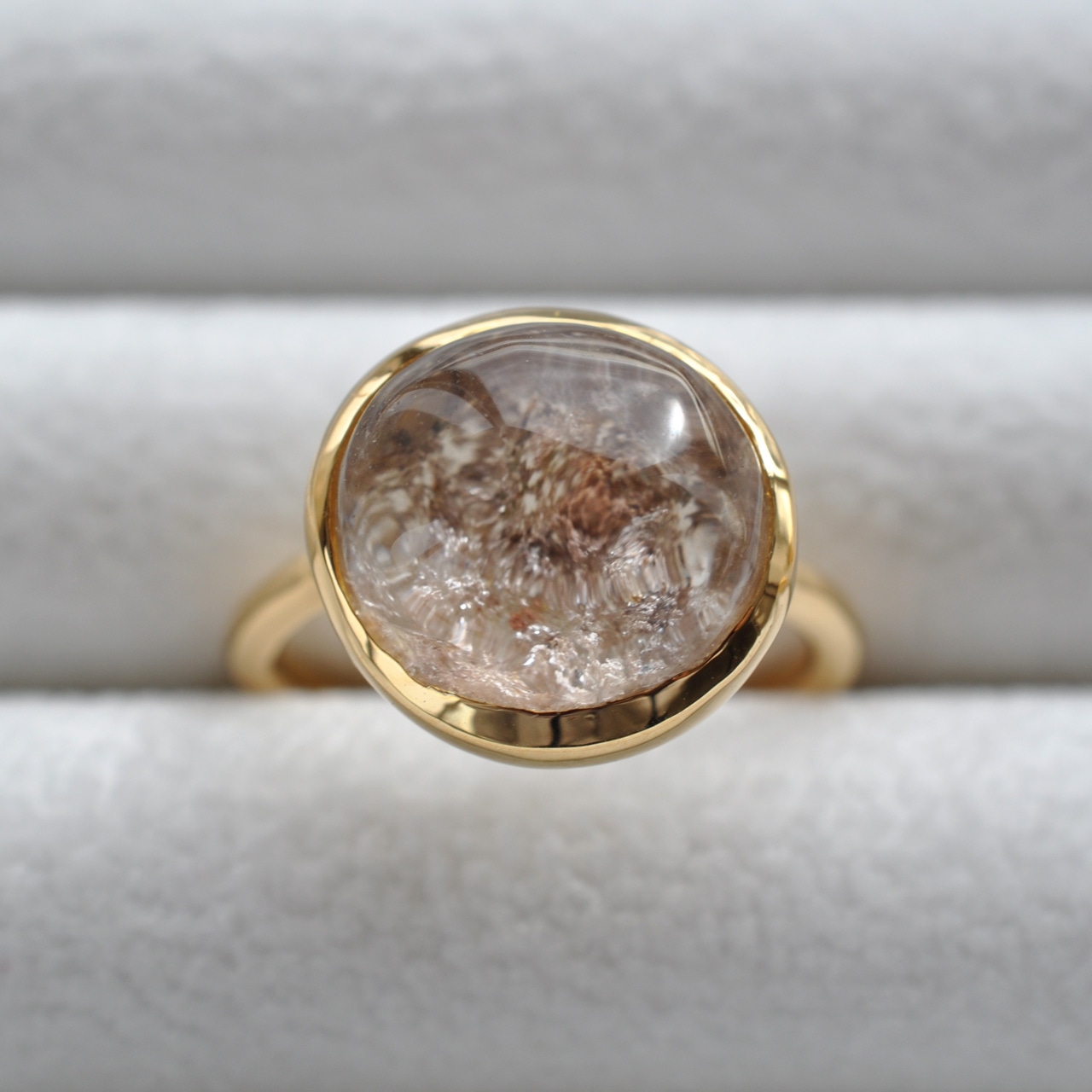 石の形に合わせて枠から作り、ころんとしたフォルムの覆輪リングに仕立てました。