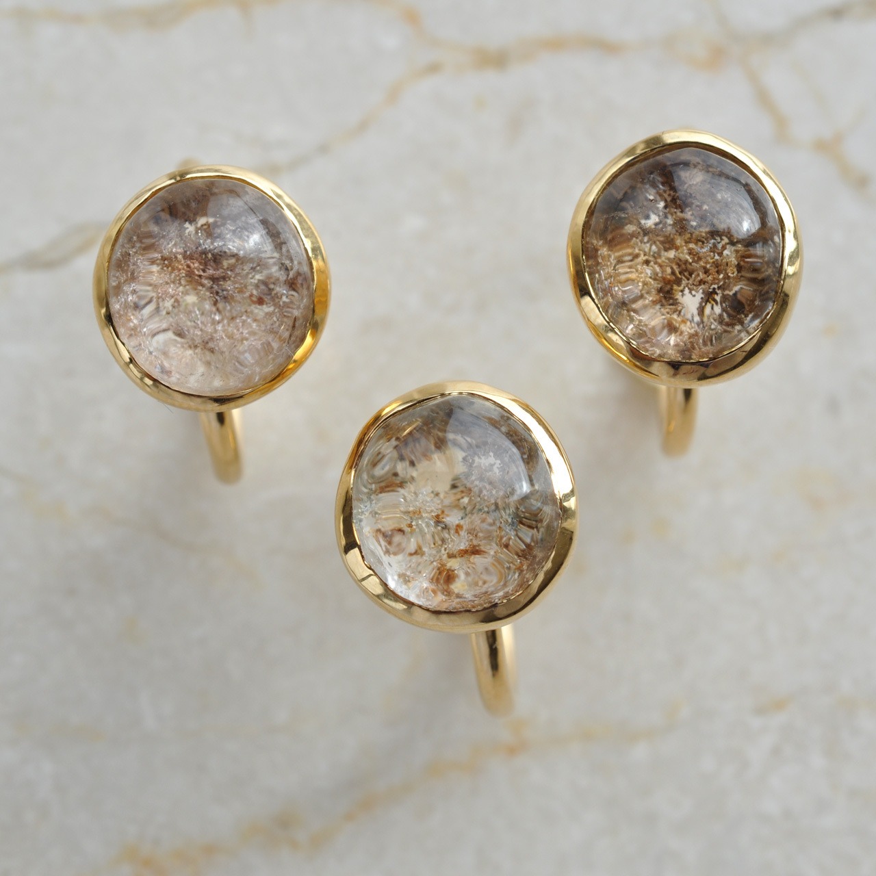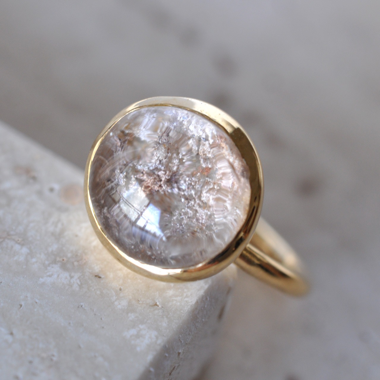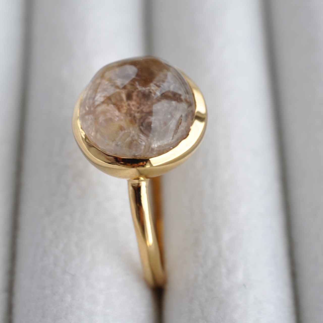石の形に合わせて枠から作り、ころんとしたフォルムの覆輪リングに仕立てました。