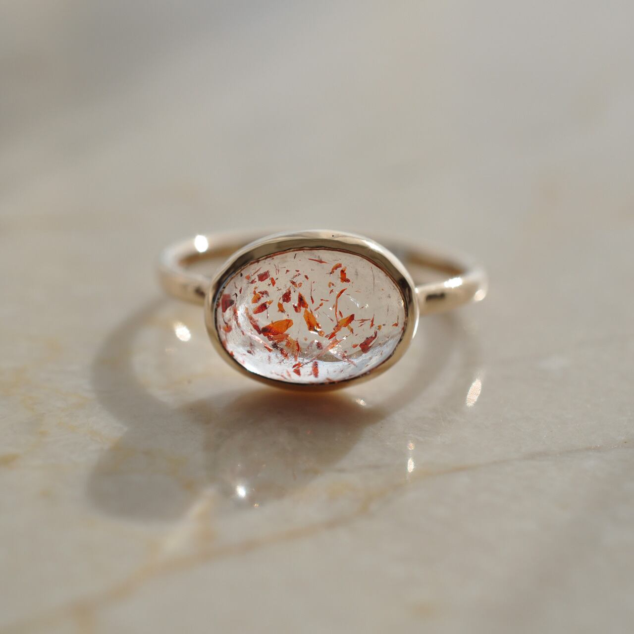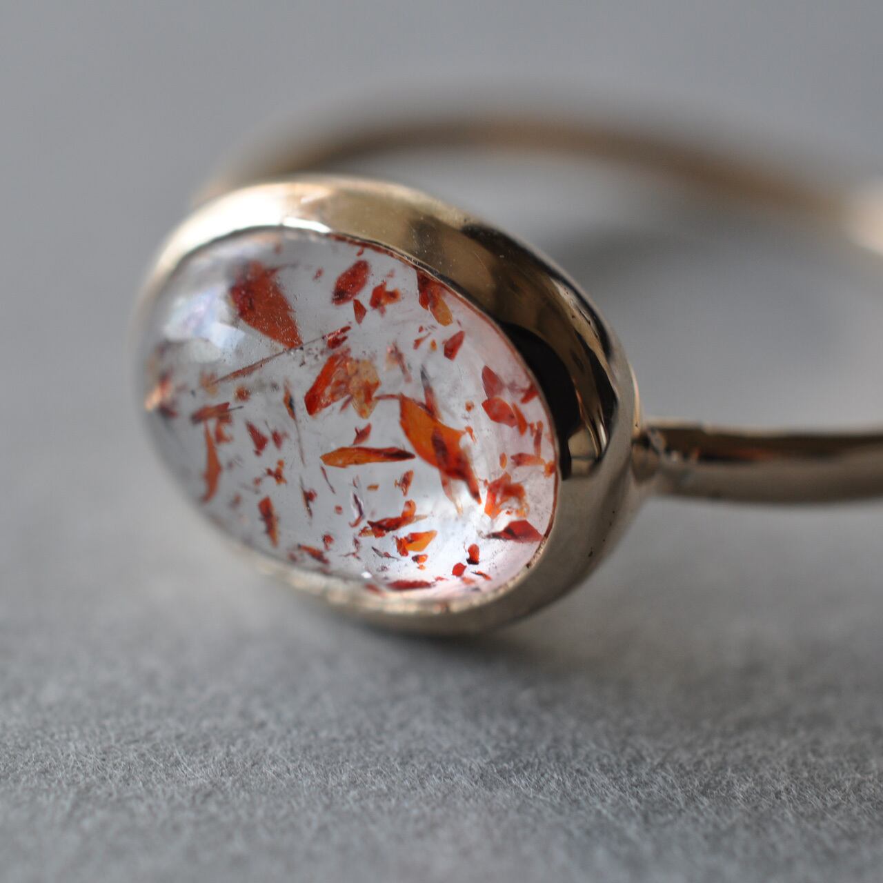 赤い花びらの様な華やかな印象のインクルージョンを包有したヘマタイトインクォーツをシンプルな覆輪の指輪に仕立てました。