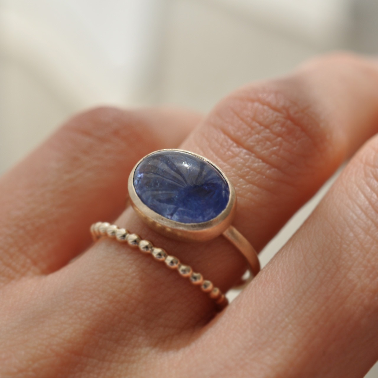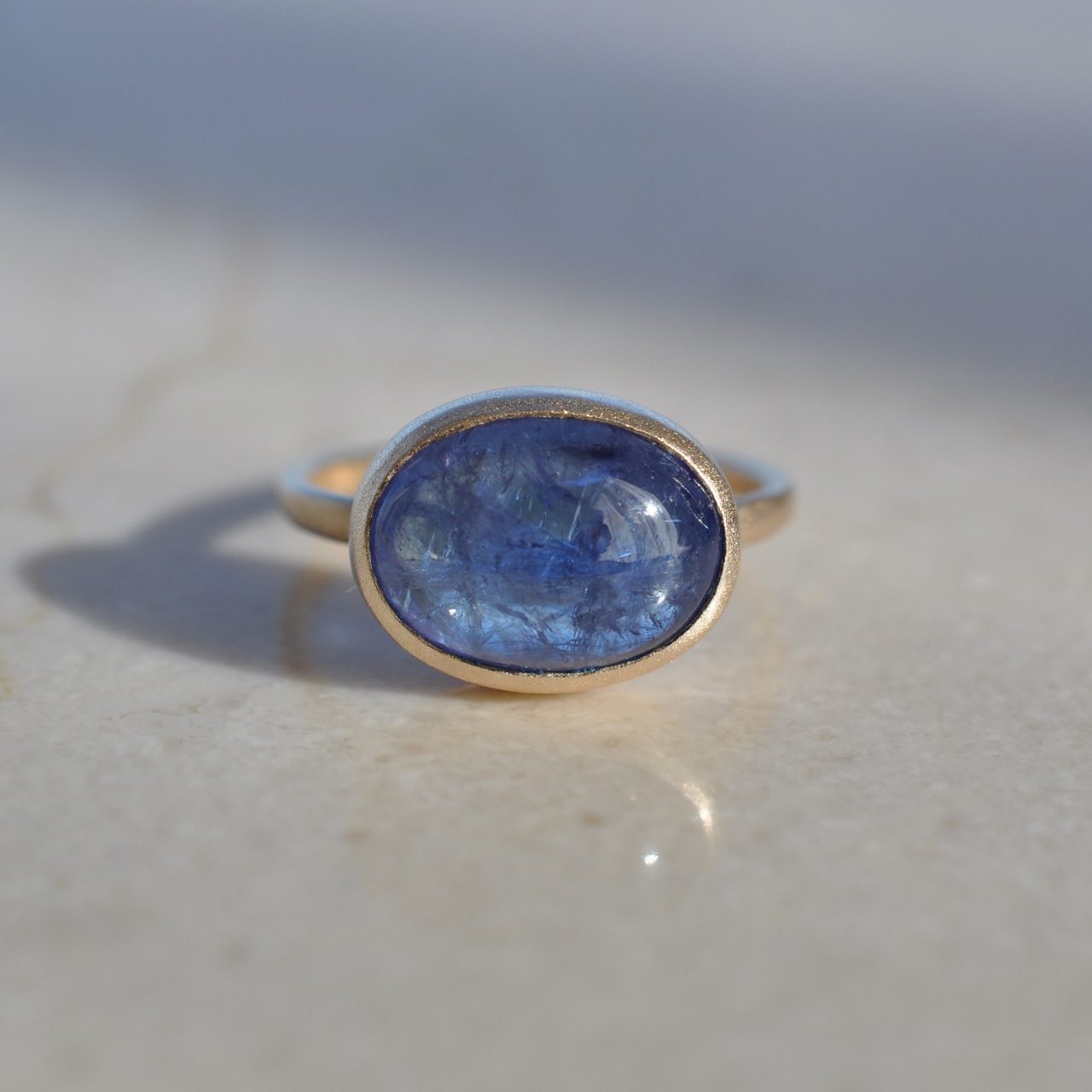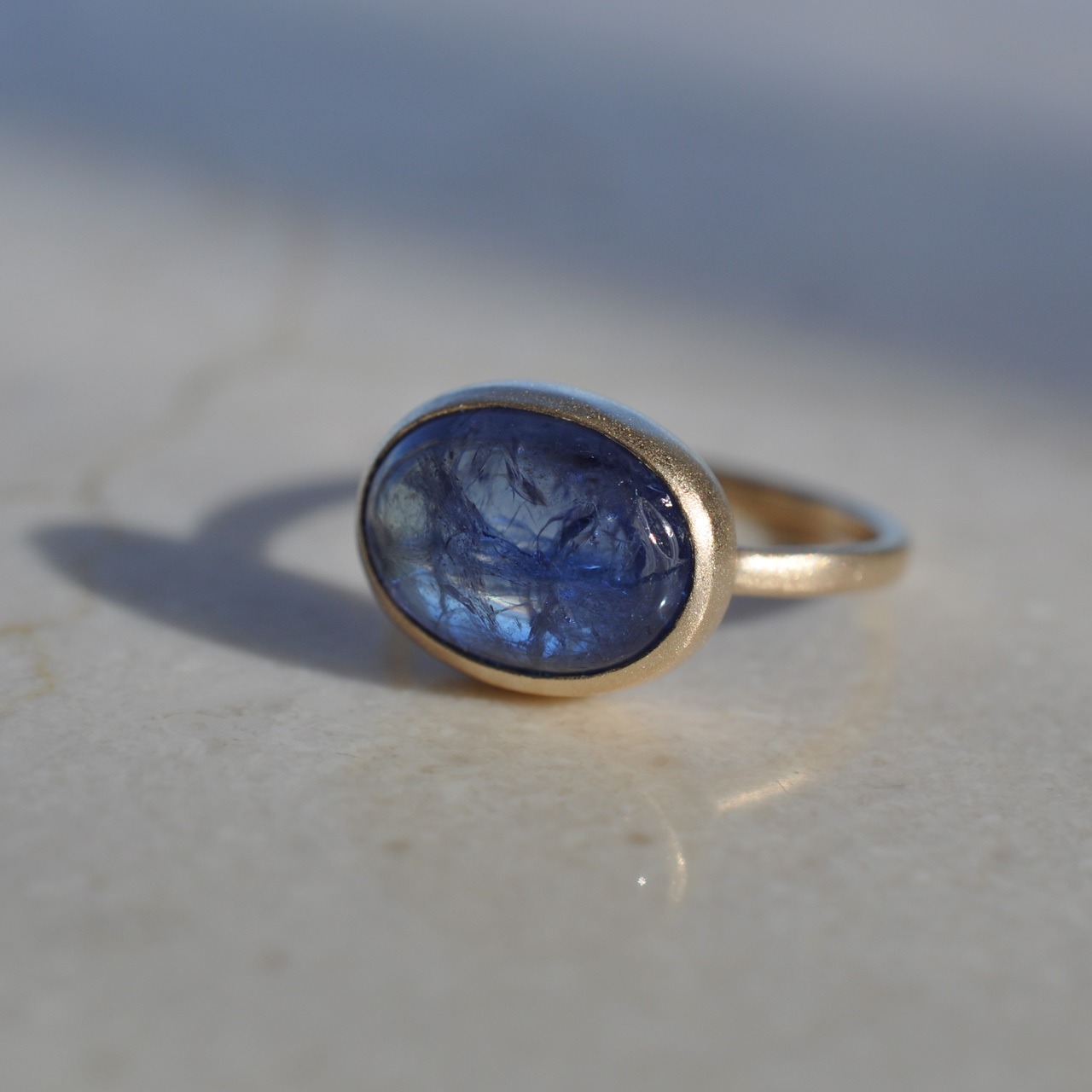 うるうるカボションカットのタンザナイトをシンプルな覆輪の指輪に仕立てました。