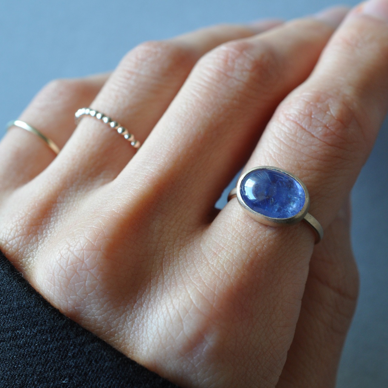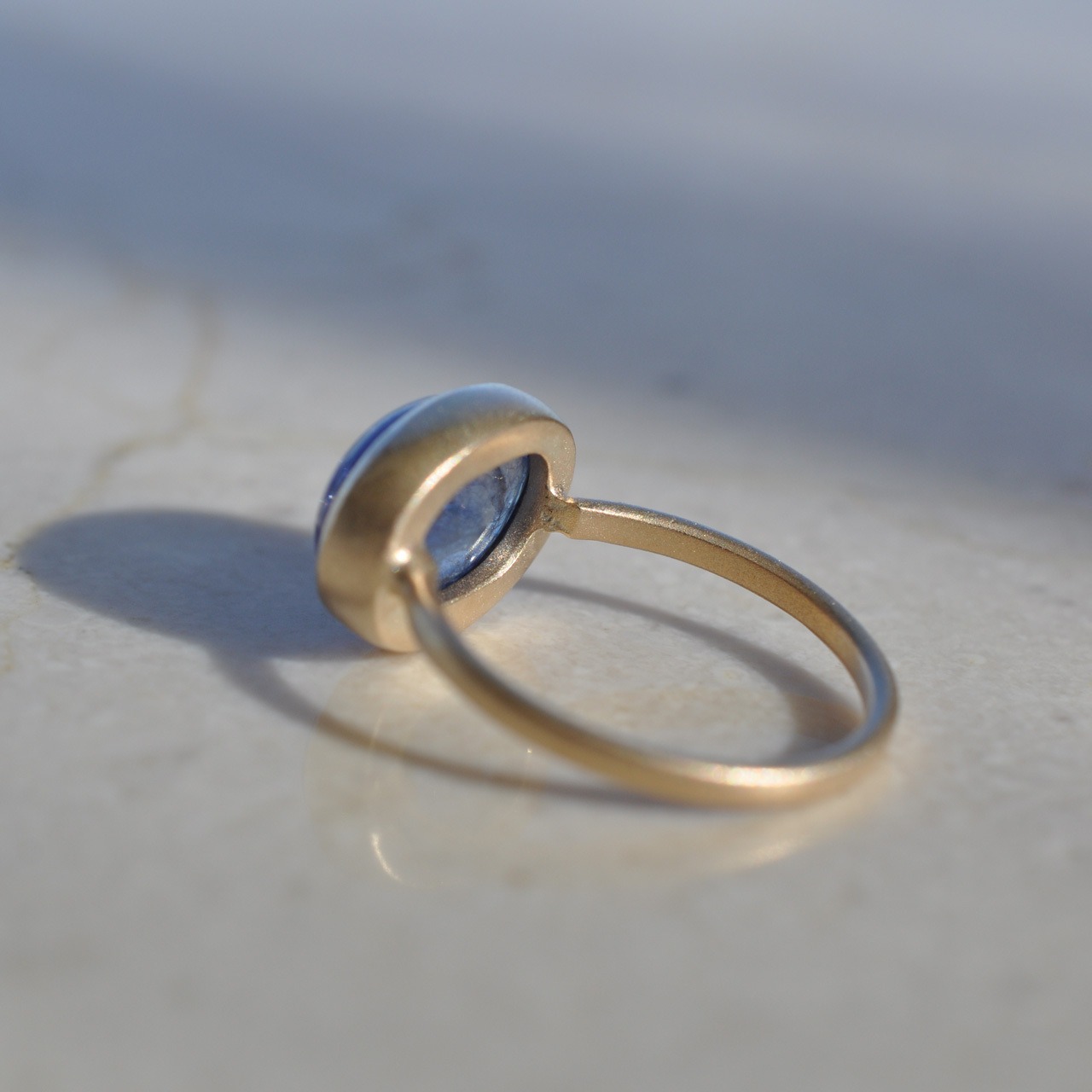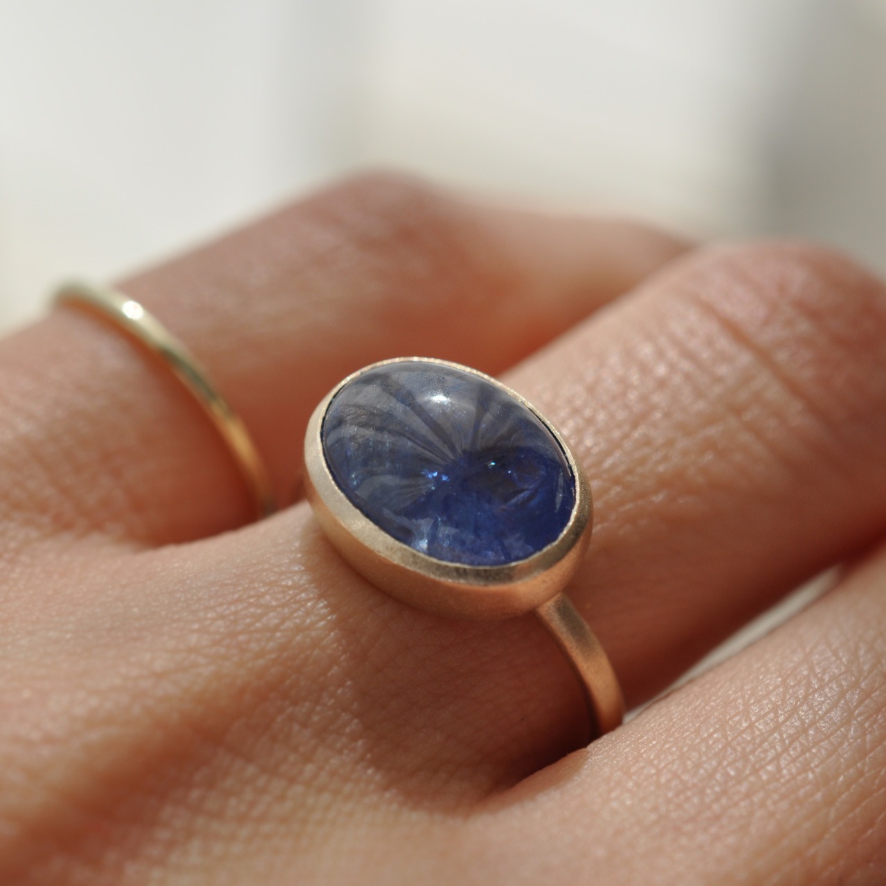 うるうるカボションカットのタンザナイトをシンプルな覆輪の指輪に仕立てました。