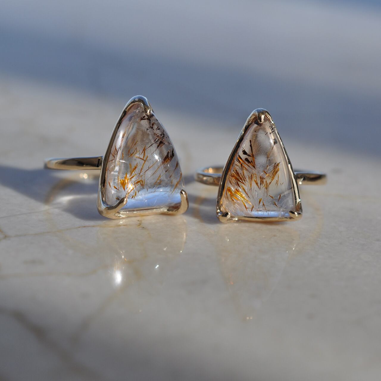 地金には綺麗に磨き上げた10Kイエローゴールドを使用し、どの角度からでもお楽しみいただけるよう爪留めのリングに仕立てました。