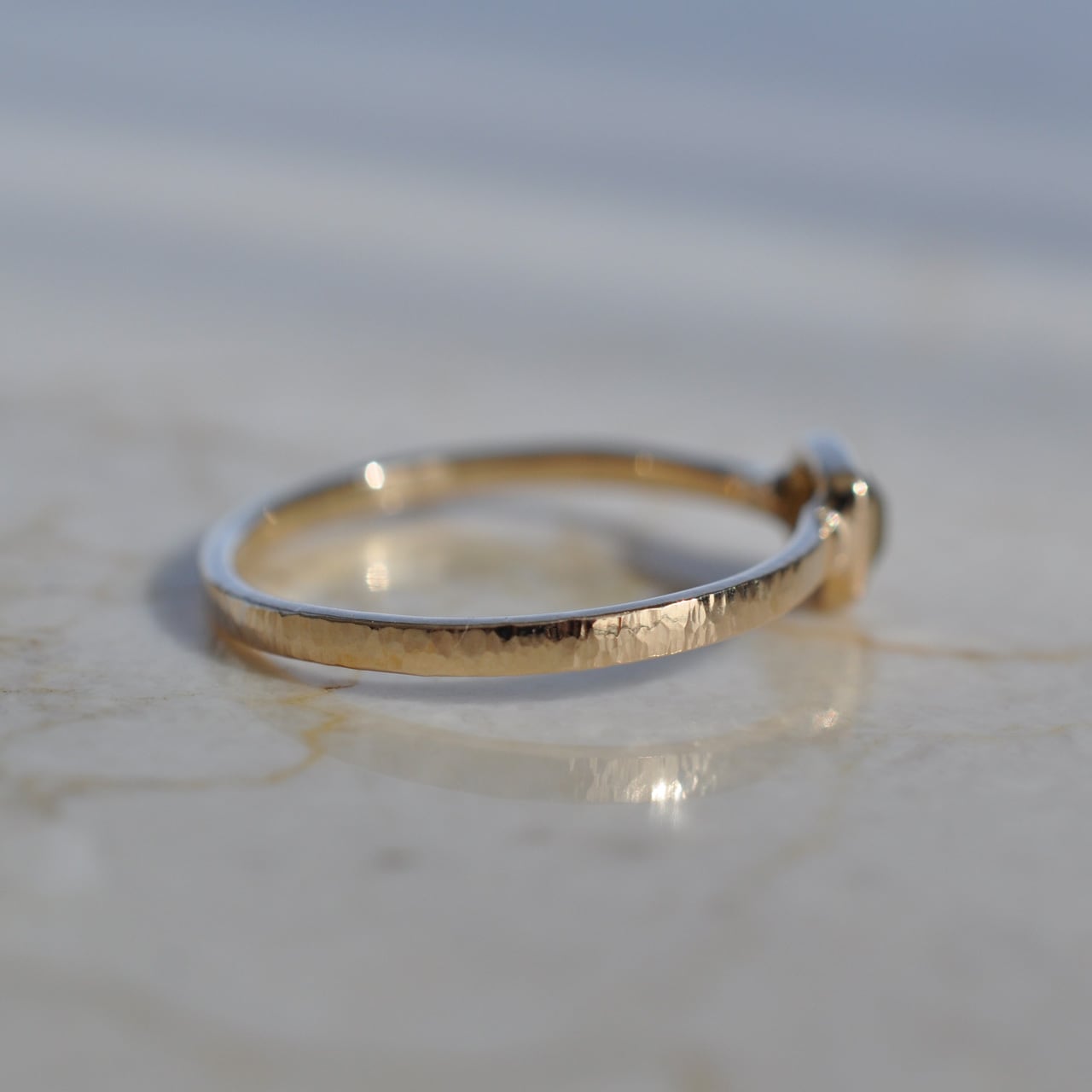 リング部分にはひとつひとつ金鎚でたたき込んで模様を施した鎚目模様のテクスチャーを細かく優しく。