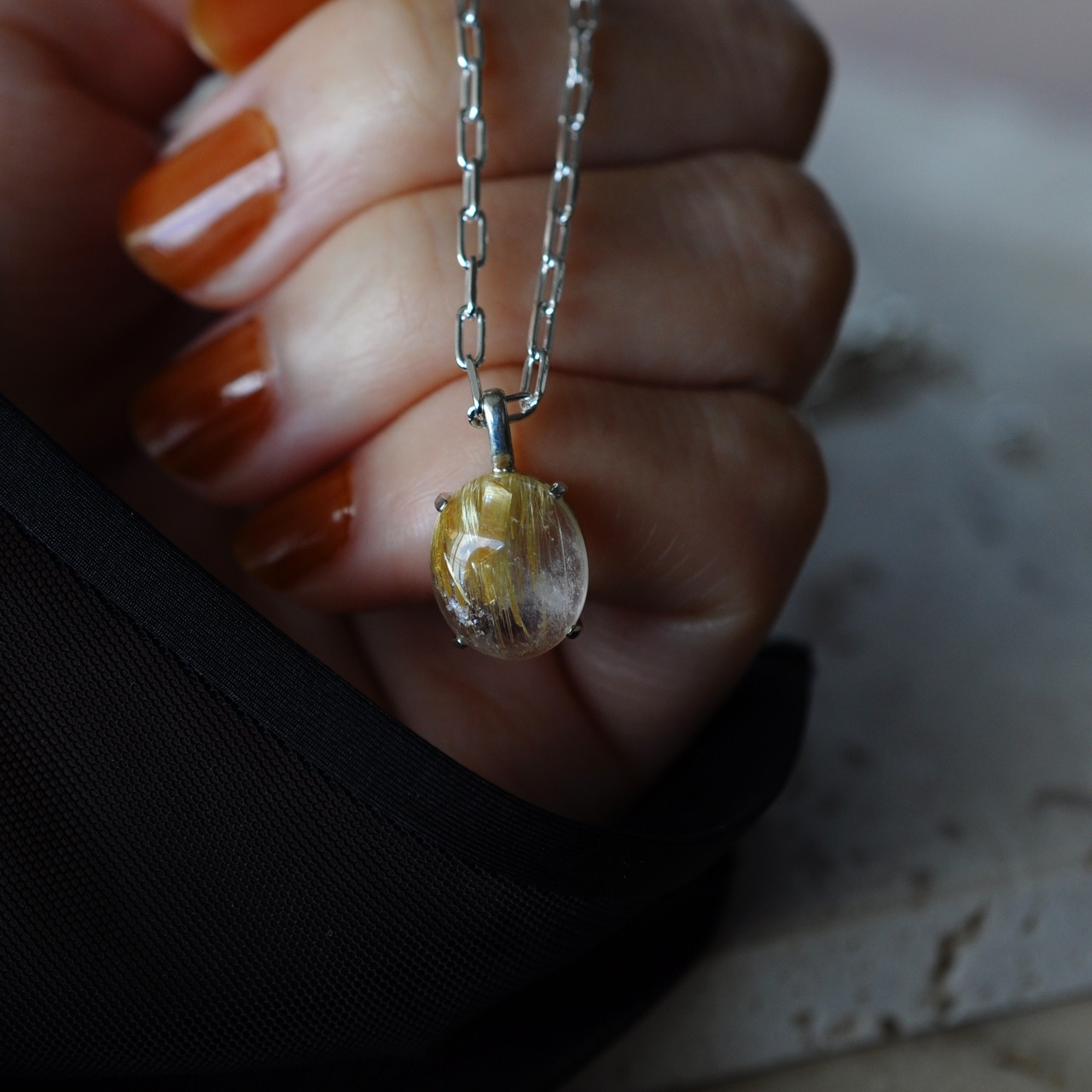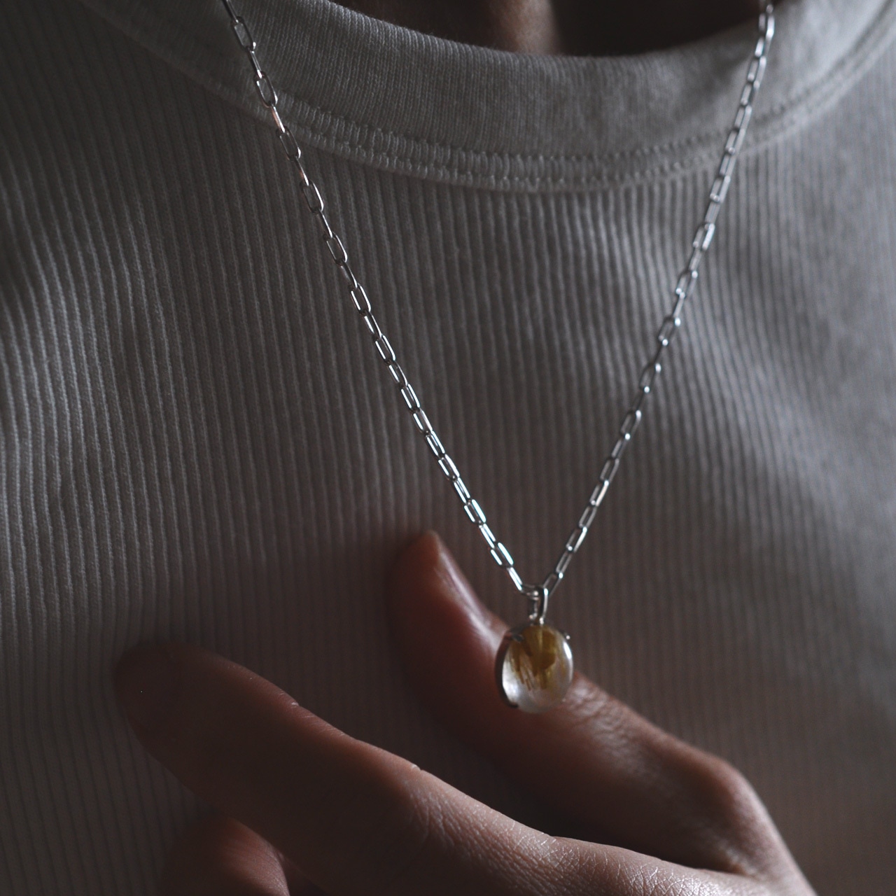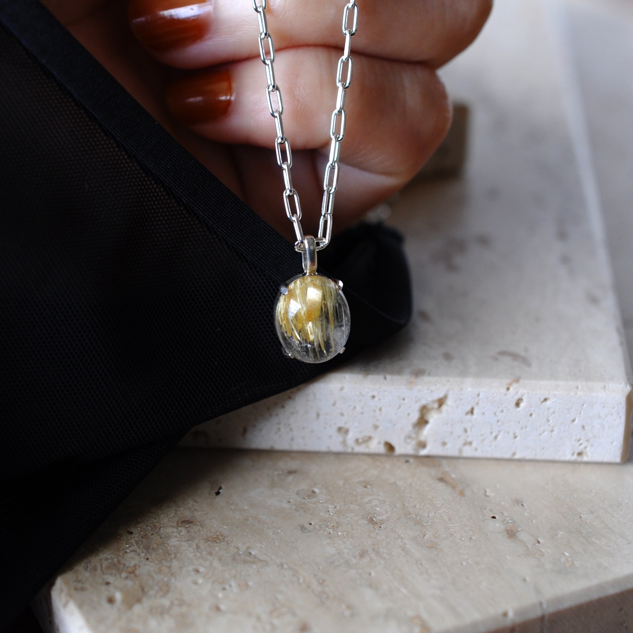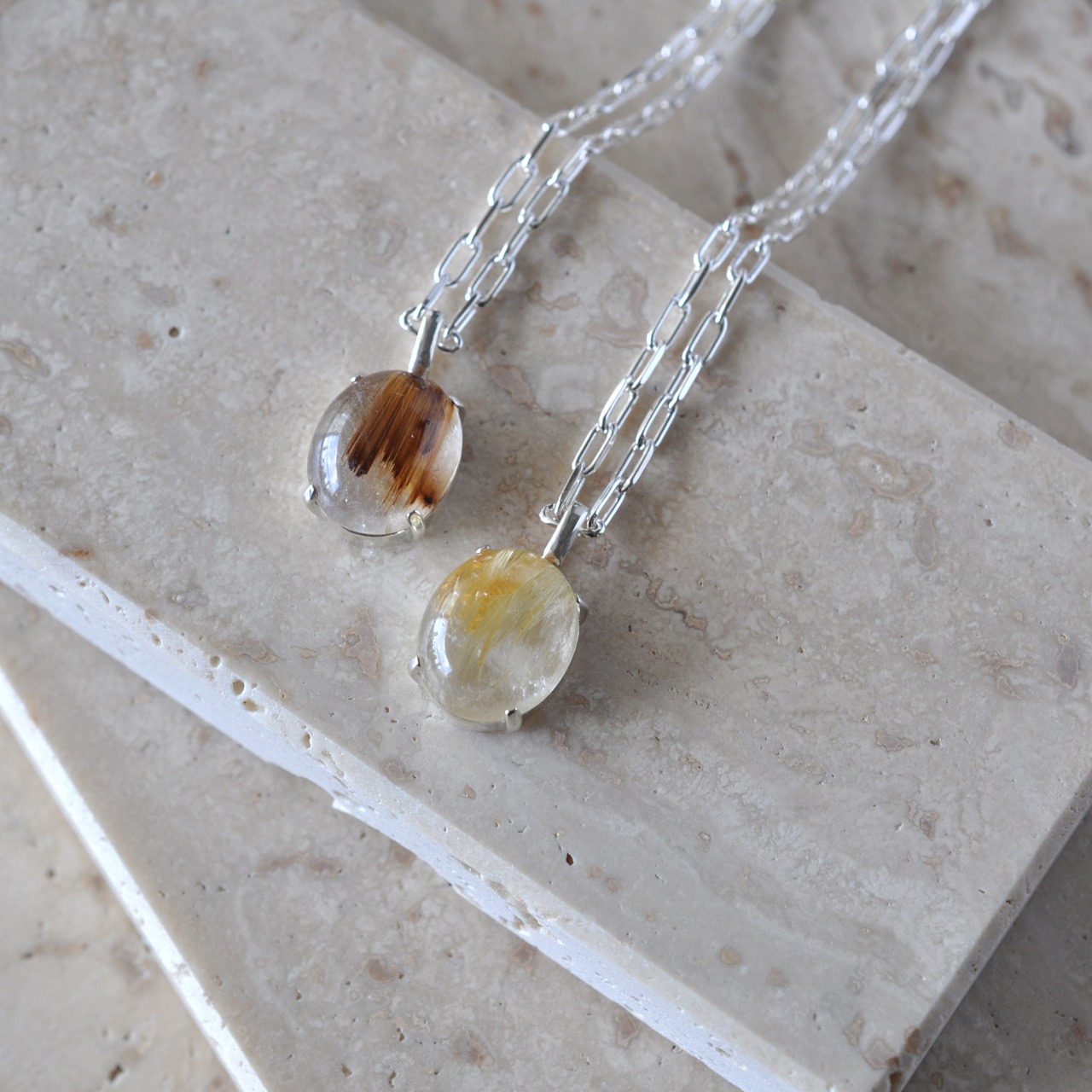 水晶越しに輝くルチルが魅力的なルチルクォーツを1点物のネックレスに仕立てました。