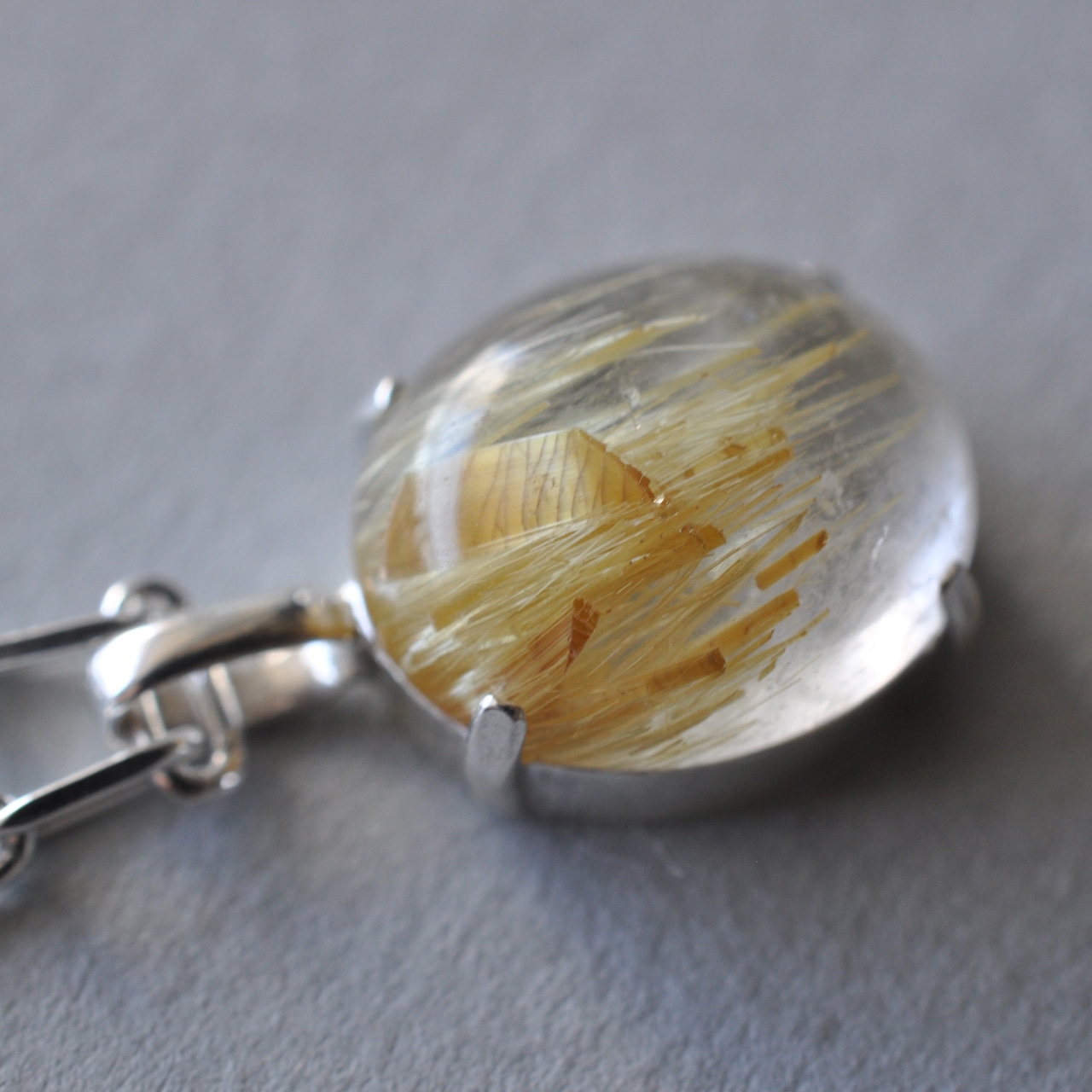 こちらはゴールドカラーのルチルが一定方向に内包されており、太い針の部分ではキャッツアイ効果もお楽しみいただけます。
