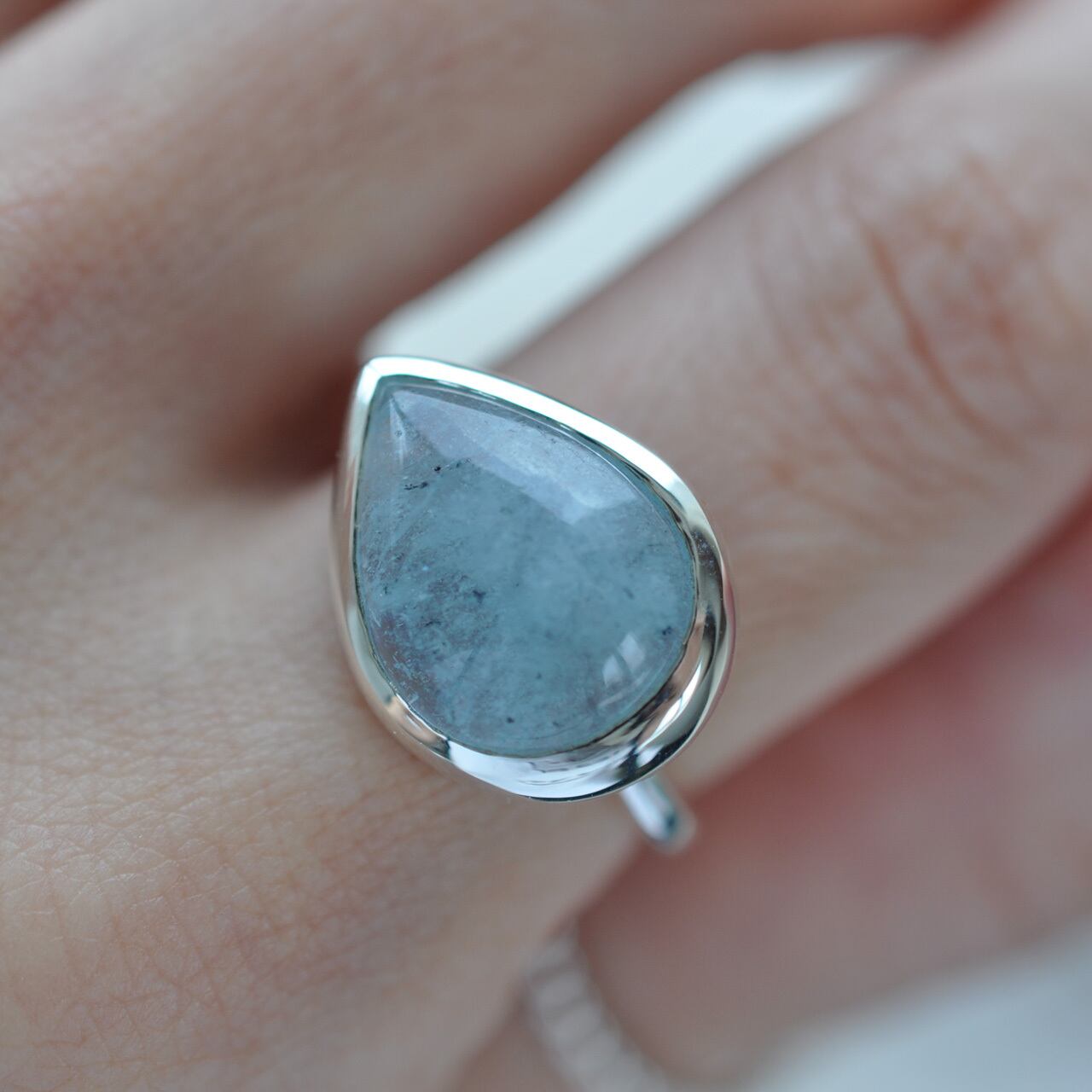 美しい雫のようなティアドロップ型のアクアマリンを覆輪リングに仕立てました。