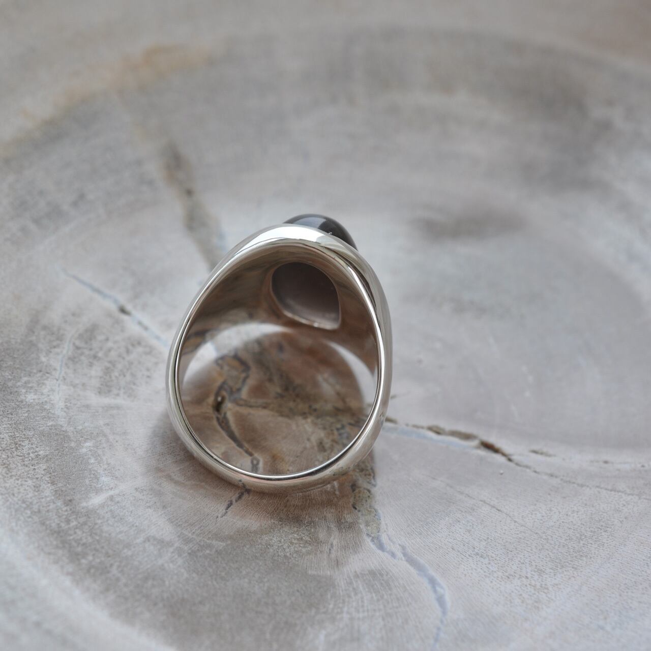 ボリュームのあるストーンの立体感を際立たせより美しく見せることができる覆輪のリングに仕立てました。