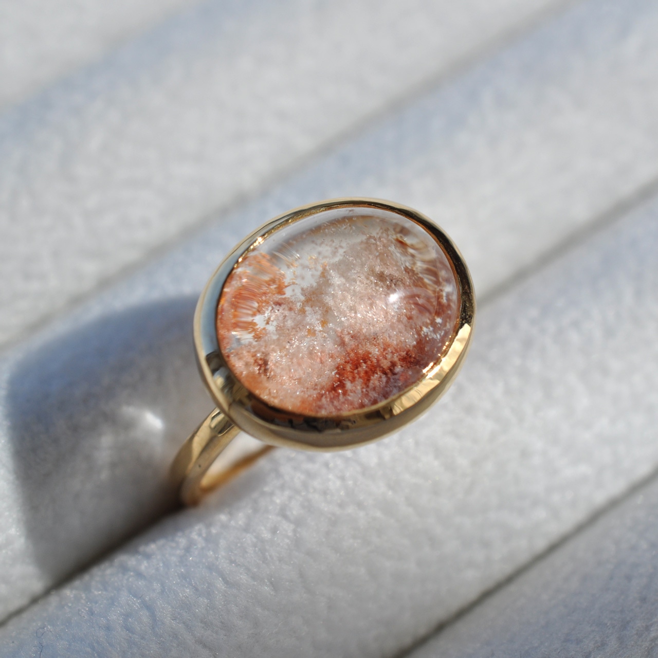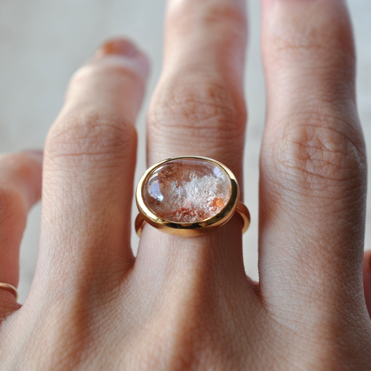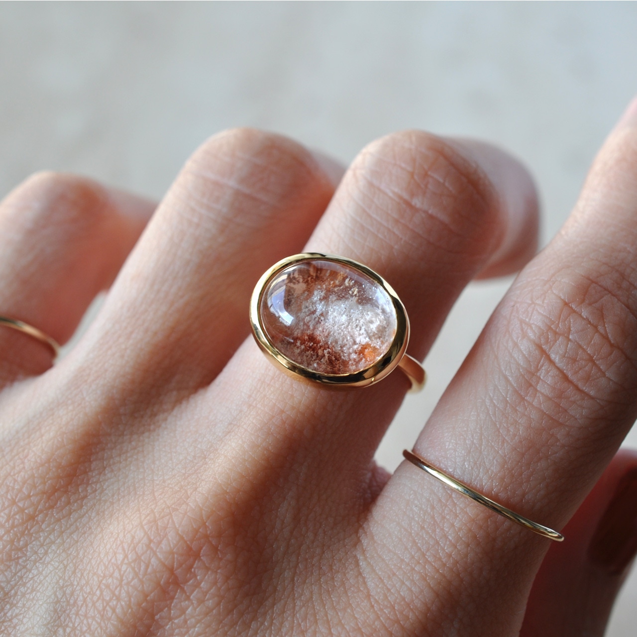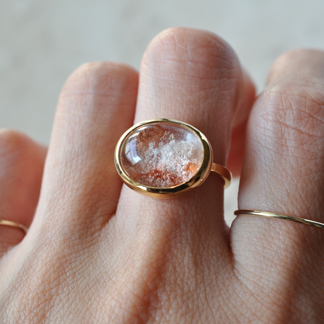 光にかざすと内包物がきらめき、どの角度からも異なる輝きを見せてくれる可愛らしさが魅力です。