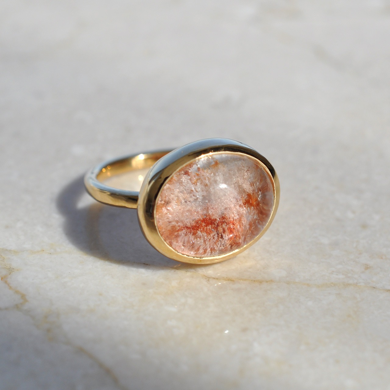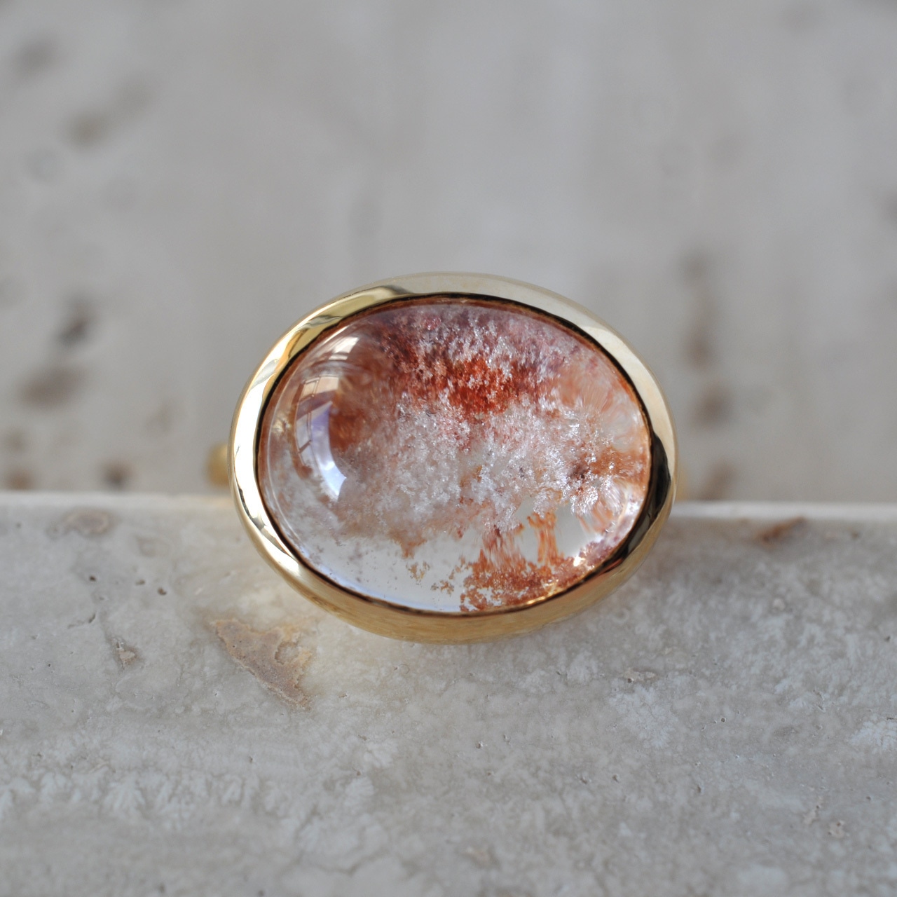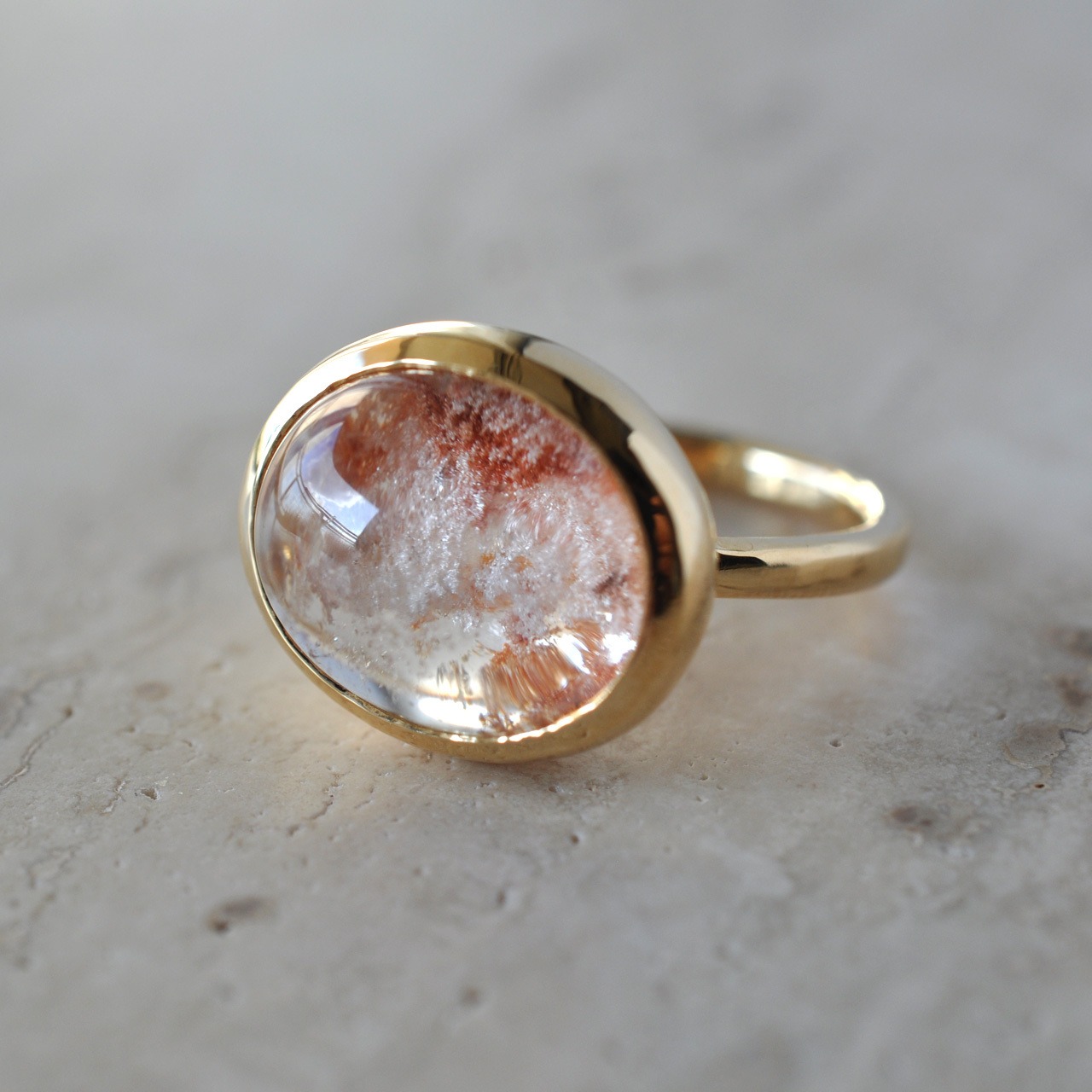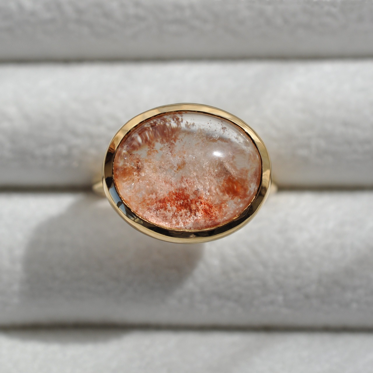 石の形に合わせて枠から作り、ころんとしたフォルムの覆輪リングに仕立てました。