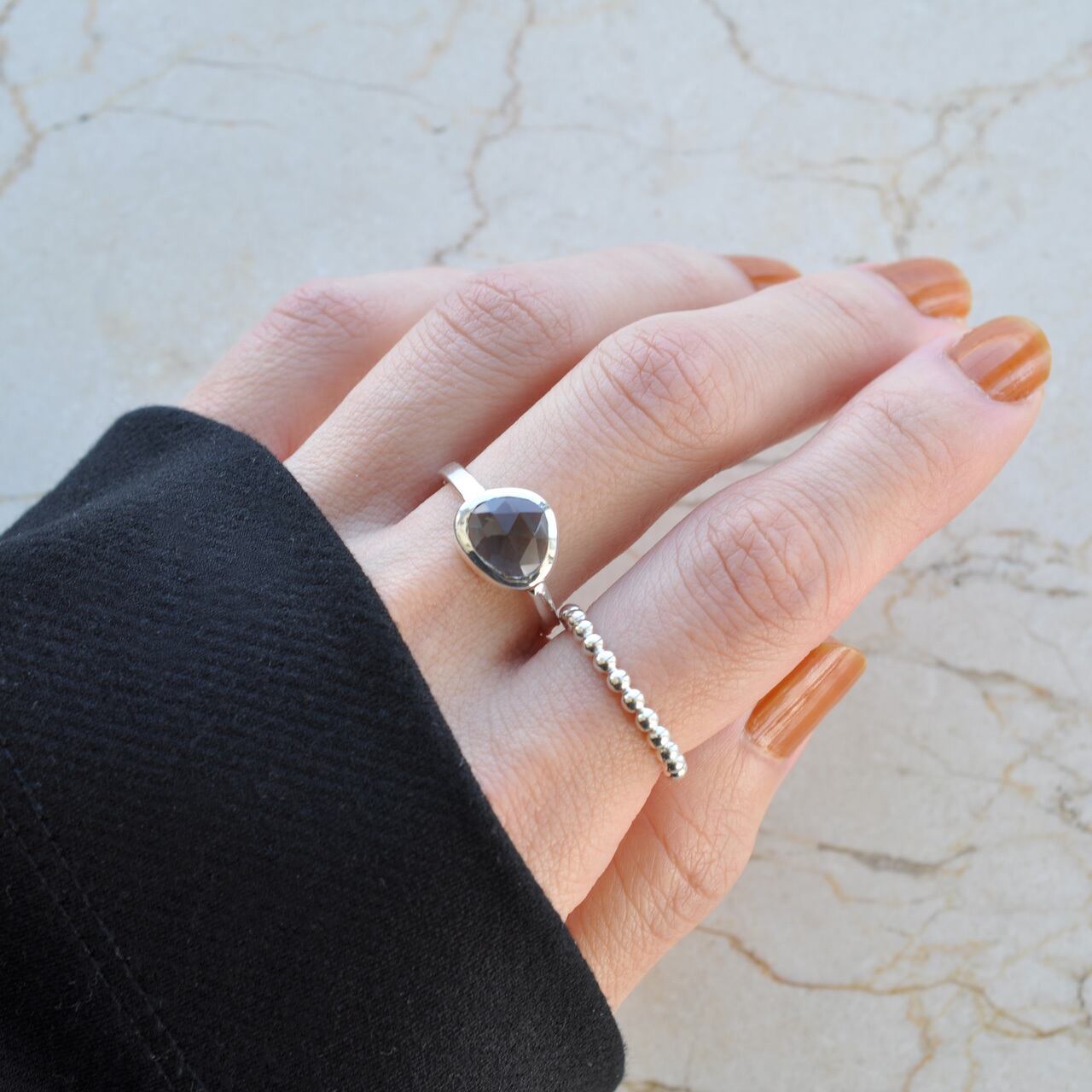 うるうると煌めくローズカットが施されたロンドンブルートパーズを覆輪リングに仕立てました。