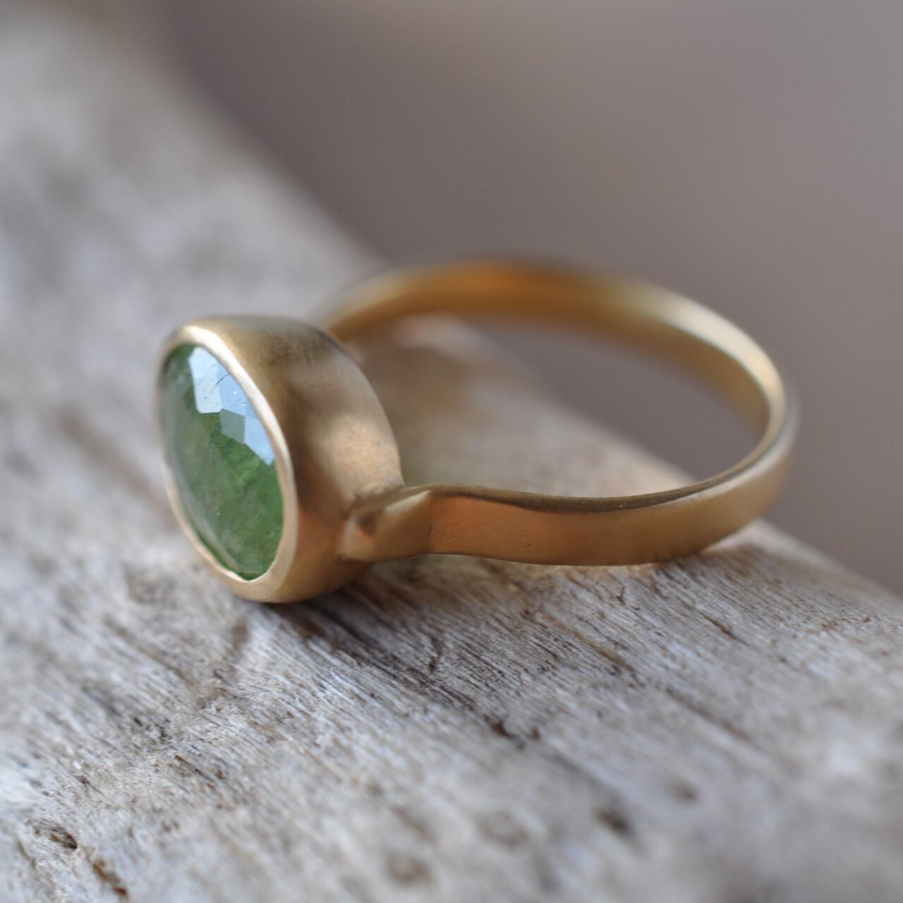 透明感のある淡いグリーンベースのインクルージョントルマリンを覆輪留めリングに仕立てました。