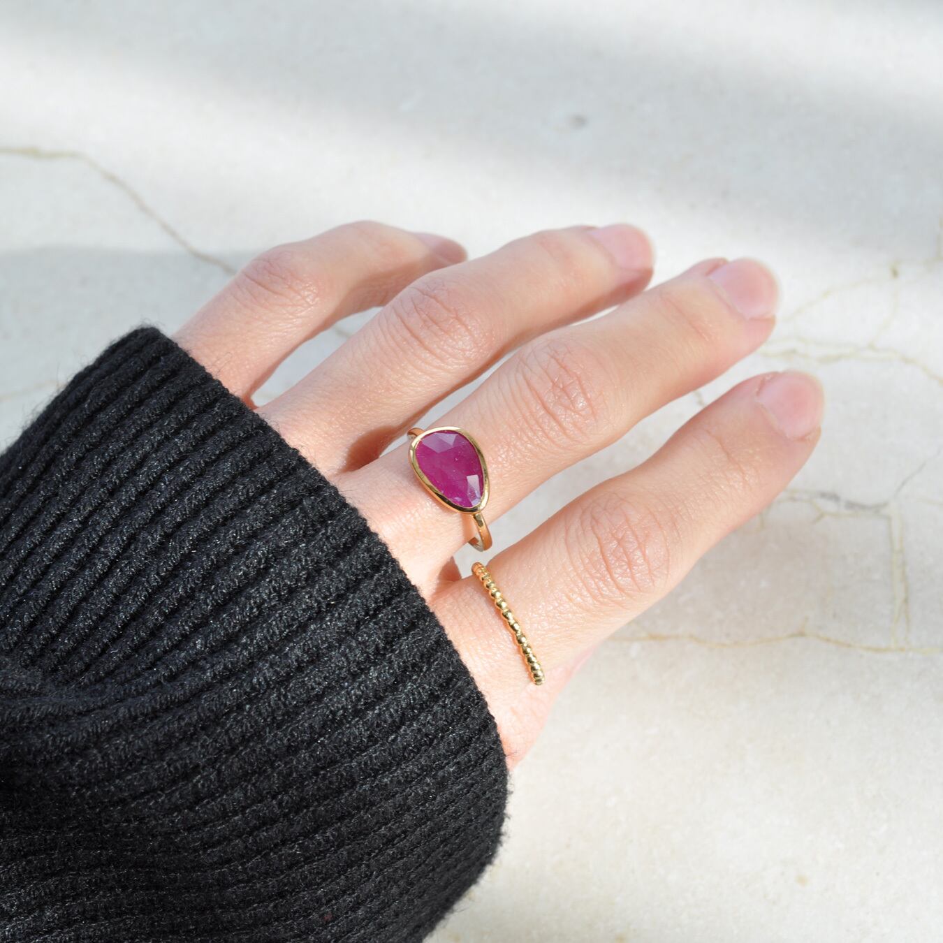 こちらは鮮やかなマゼンダピンクが目を引くファンシーカットのルビーリング。