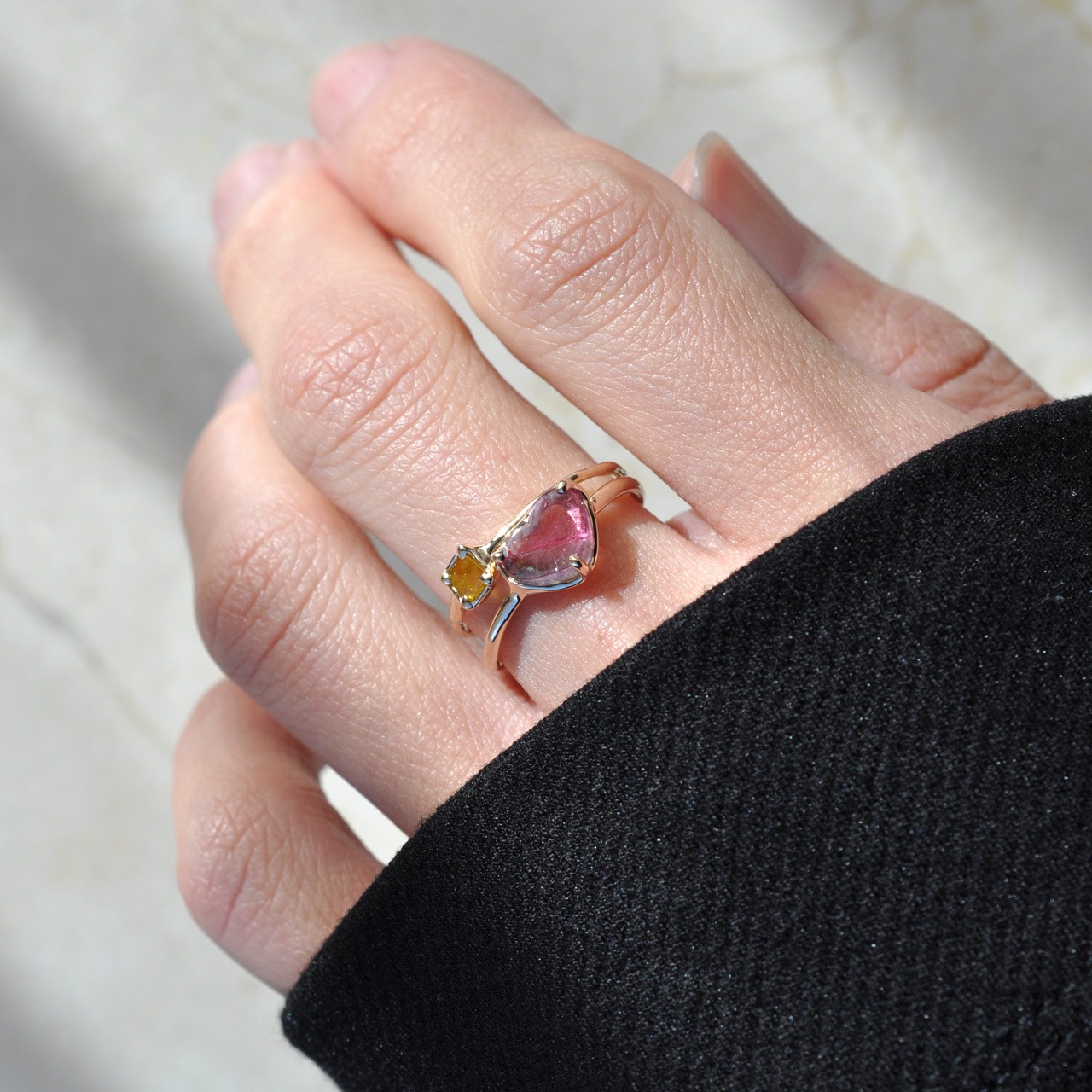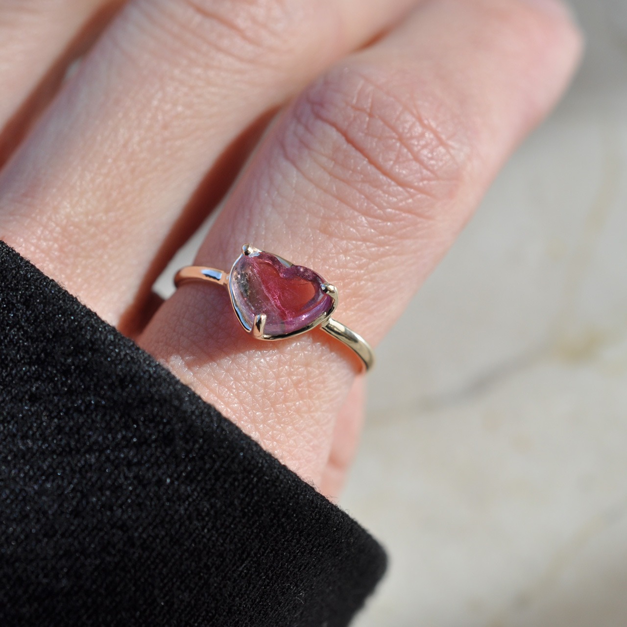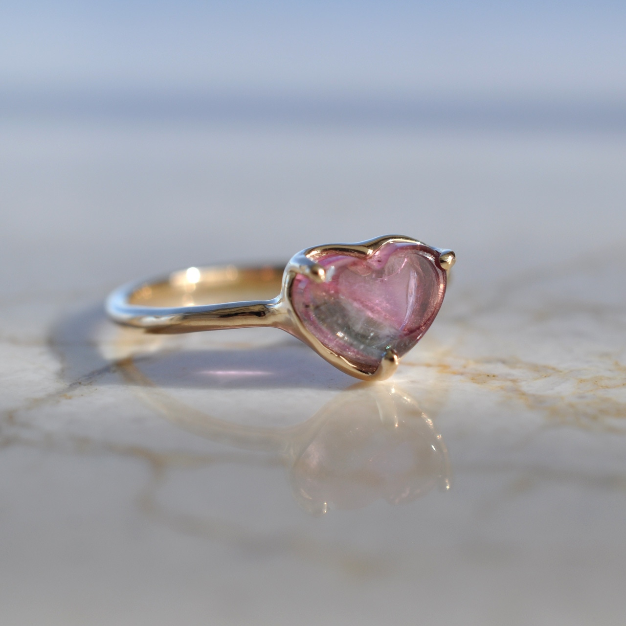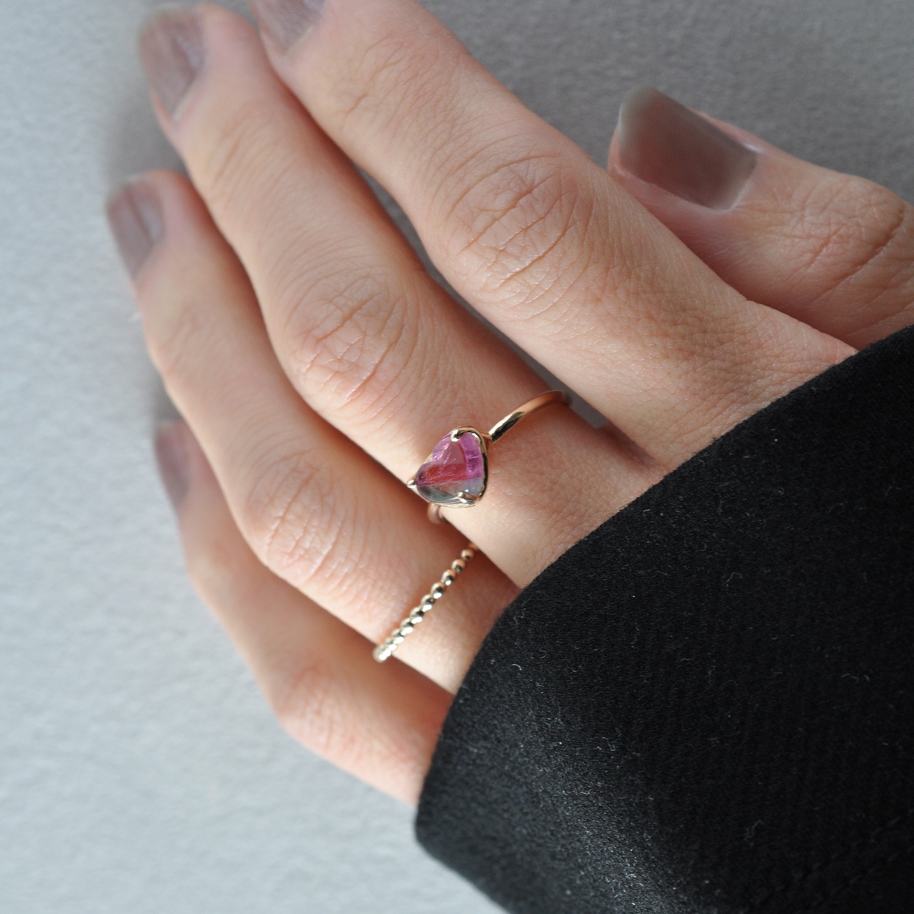 艶やかなハートシェイプのバイカラートルマリンを爪留めでセットし、手元を見るたびに心ときめくような、キュートな指輪に仕立てました。