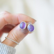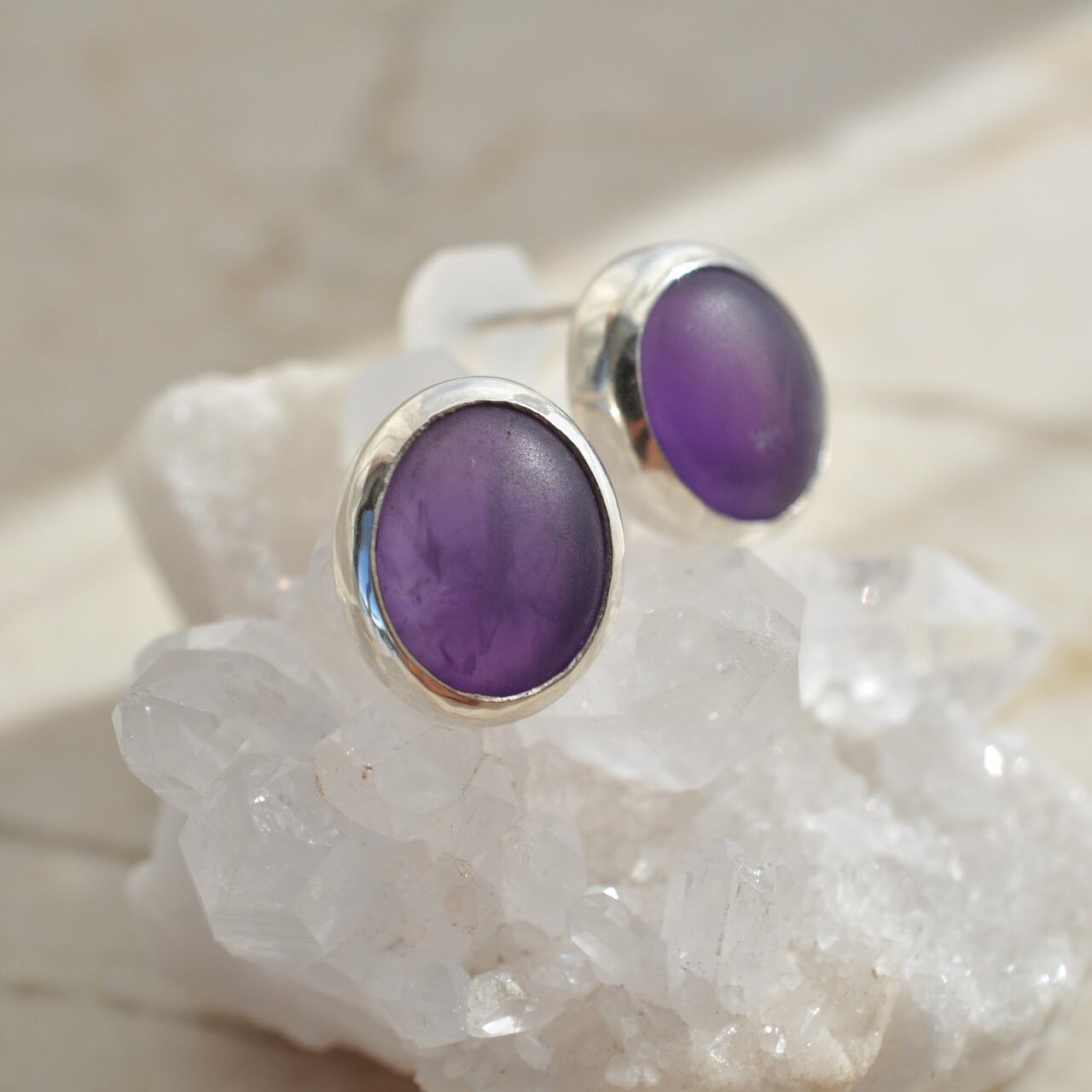 マットな艶消しが施されたアメジストをシルバーで包み込み、大人の遊び心を感じさせるスタッドピアスに仕立てました。